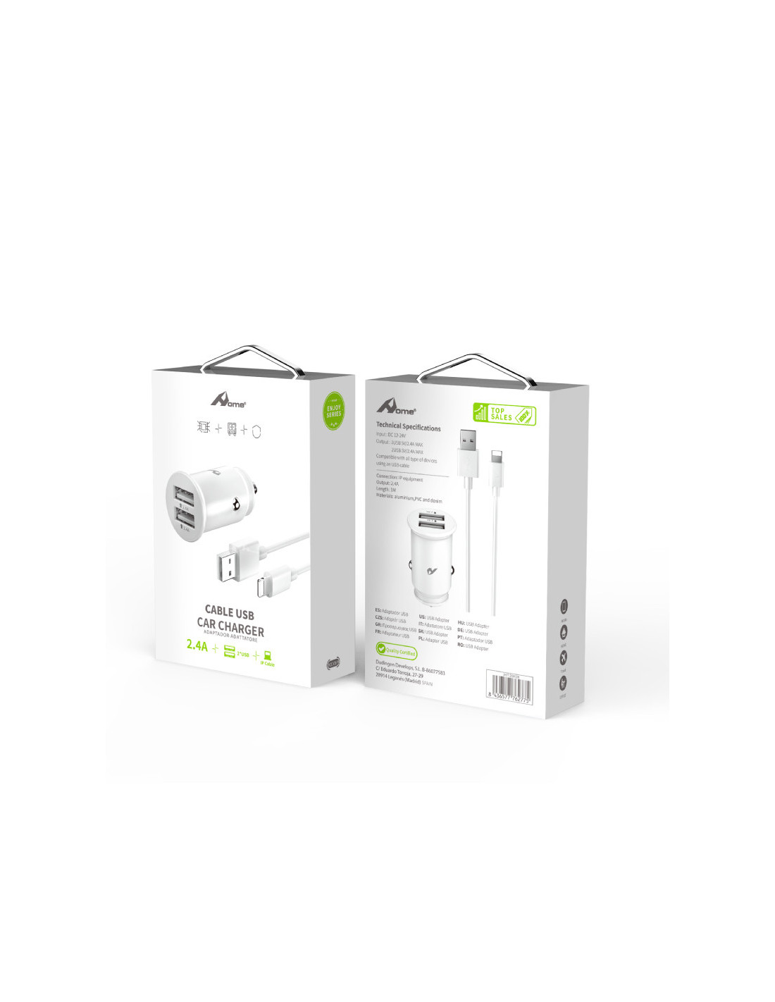 Home YCC-01IP. Tipo de cargador: Auto, Alimentación: Encendedor de cigarrillos, Compatibilidad del cargador: Universal. Voltaje de entrada: 12 - 24 V, Voltaje de salida máximo: 5 V. Cantidad de puertos USB 2.0: 2. Longitud de cable: 1 m, Color del producto: Blanco