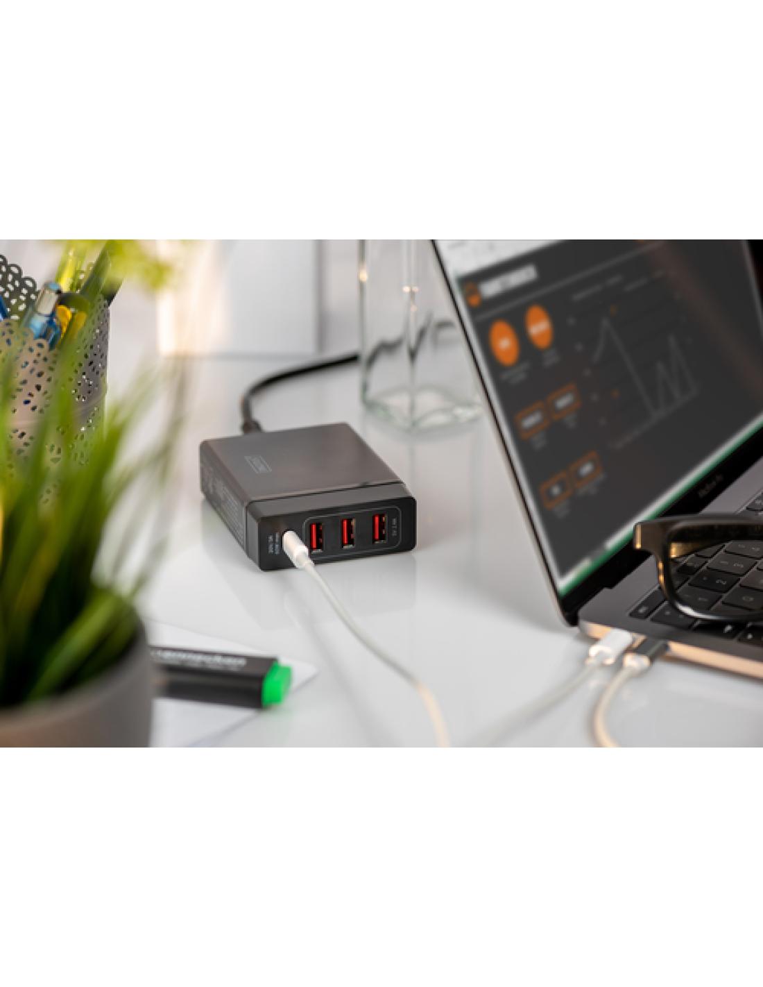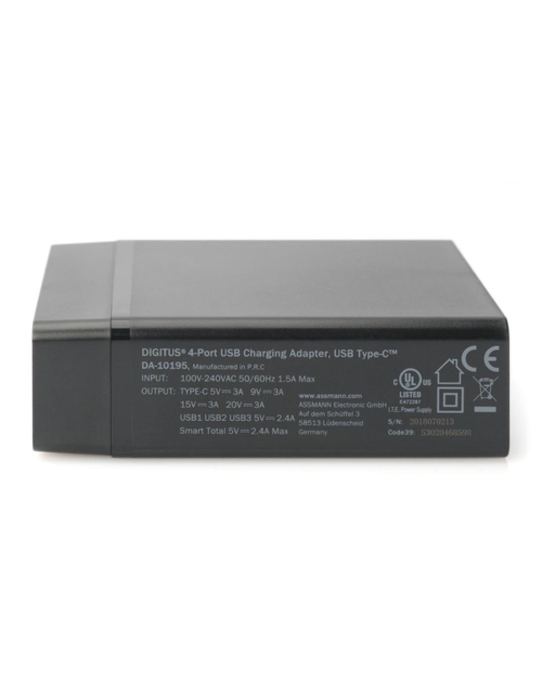 El cargador USB Digitus® de 4 puertos USB Type-C ™ es una estación de carga universal para todos sus dispositivos. El puerto de carga USB-C (5-20 V / 3 A / 60 W máx.) con la funcionalidad de suministro de potencia (PD) 2.0 recarga ultrabooks, notebooks, tablets, smartphones, consolas de juegos móviles, etc. de forma rápida y eficiente. Acerca de los tres puertos de carga USB-A (total: 5 V/2,4 A, cada puerto puede ofrecer hasta 5 V/2,4 A máx.) permite cargar cualquier tipo de dispositivo móvil como smartphones, tablets, baterías externas, altavoces, etc. La potencia total es de 72 W.