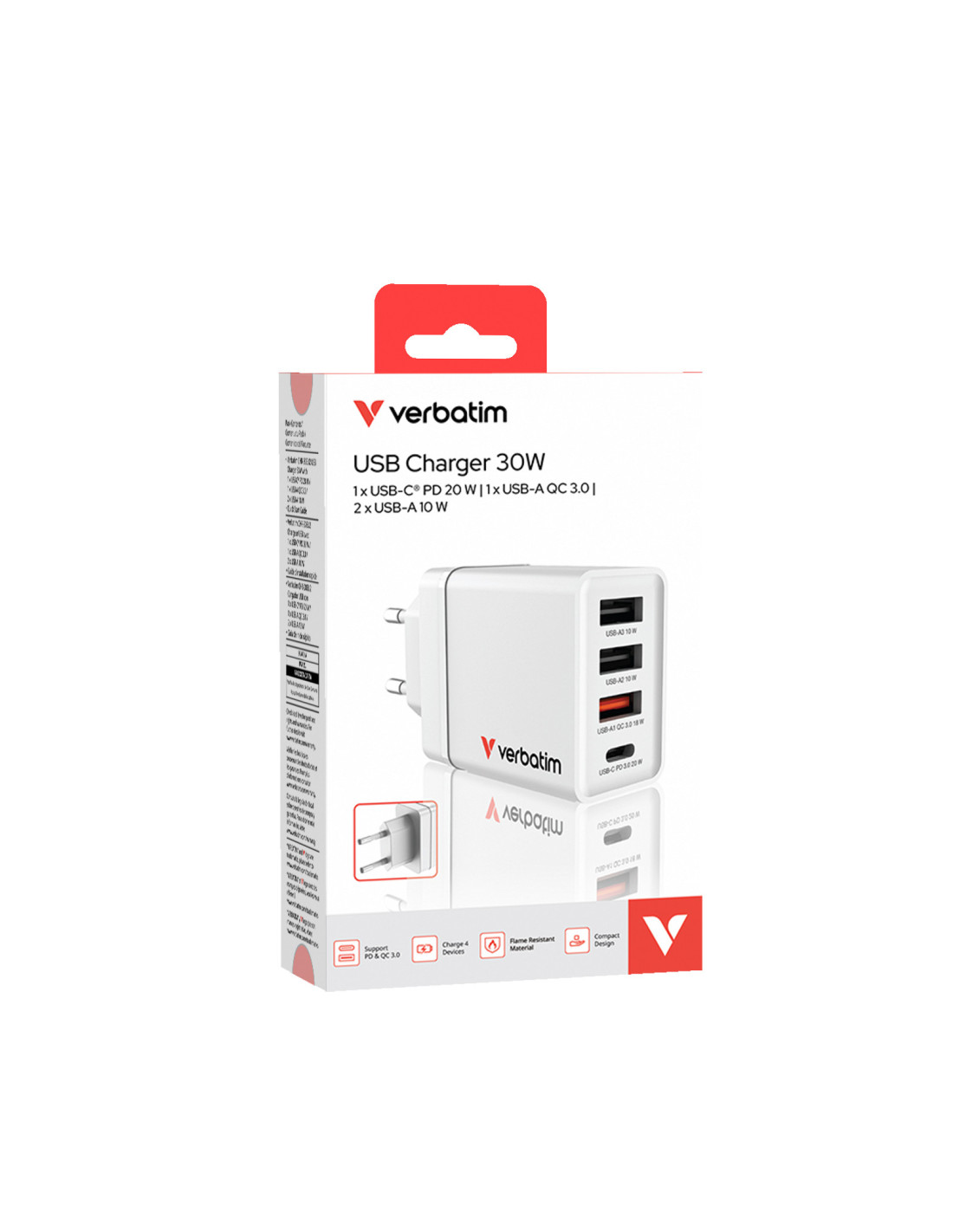 Verbatim 49700. Tipo de cargador: Interior, Alimentación: Corriente alterna, Compatibilidad del cargador: Universal. Voltaje de entrada: 100 - 240 V. Cantidad de puertos USB 2.0: 2, Número de puertos USB Tipo C: 1, Carga rápida, Funciones de protección de poder: Sobreintensidad, Sobrevoltaje, Sobrecalentamiento, Cortocircuito. Color del producto: Blanco