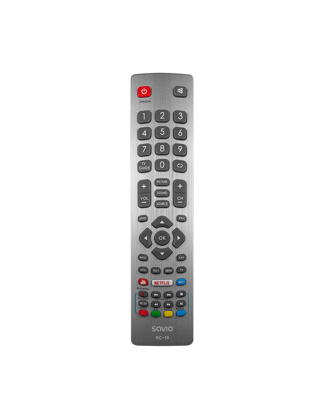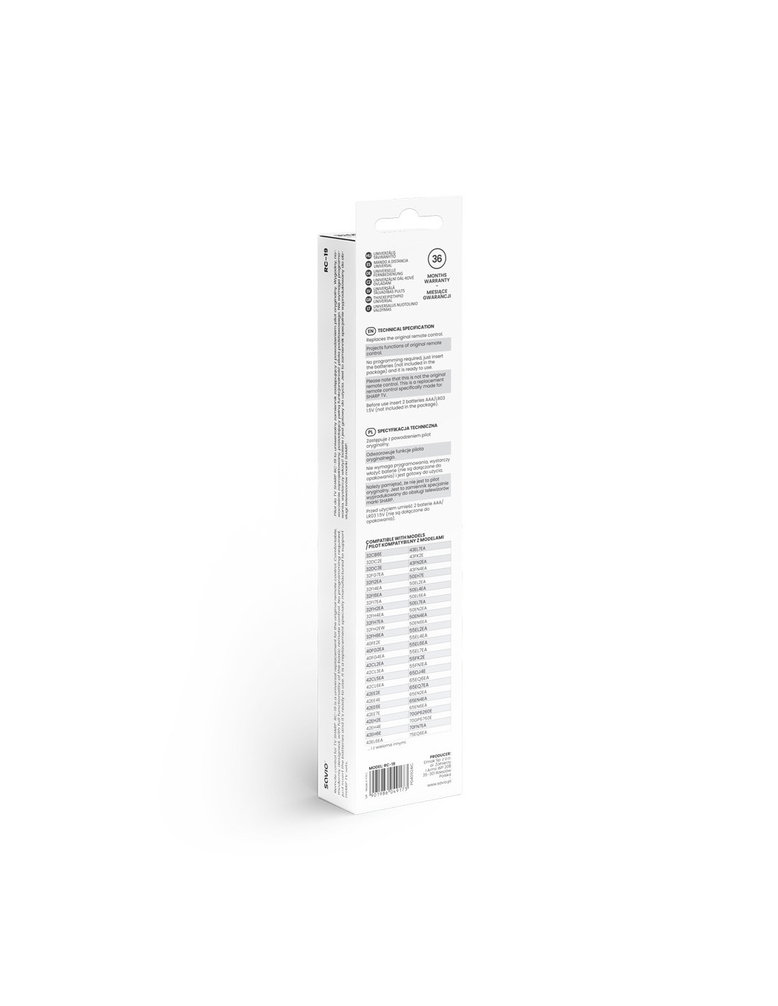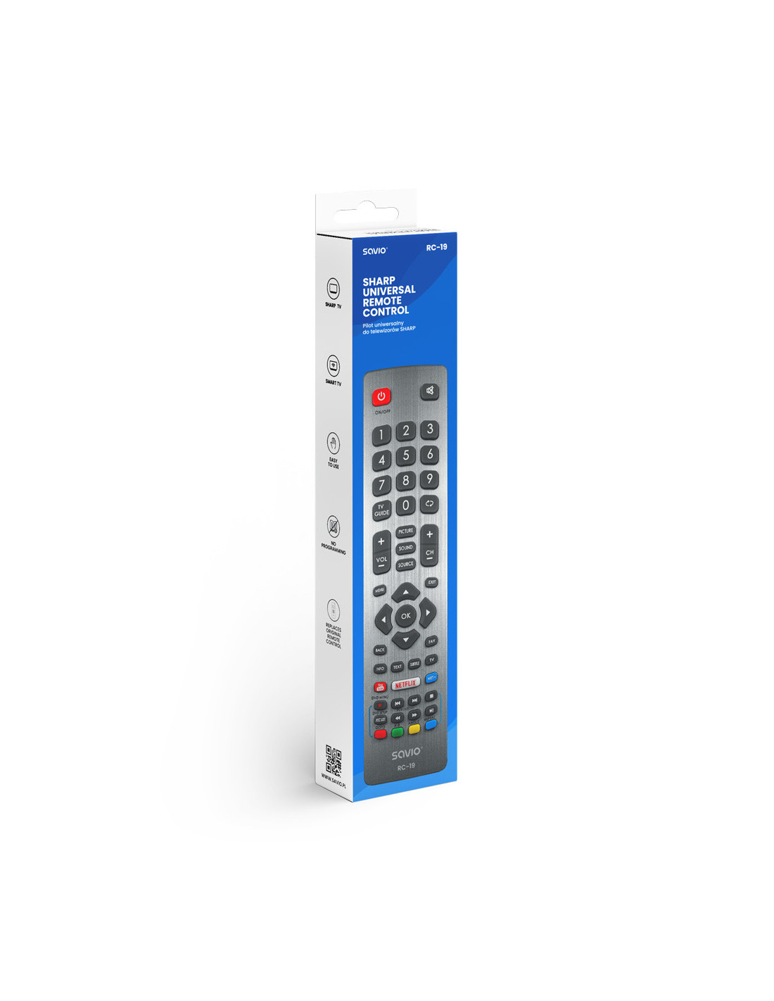 Savio RC-19. Marca compatible: Sharp, Uso adecuado del control remoto: Universal. Alcance máximo: 10 m. Tipo de entrada: Botones, Cantidad de botones: 47