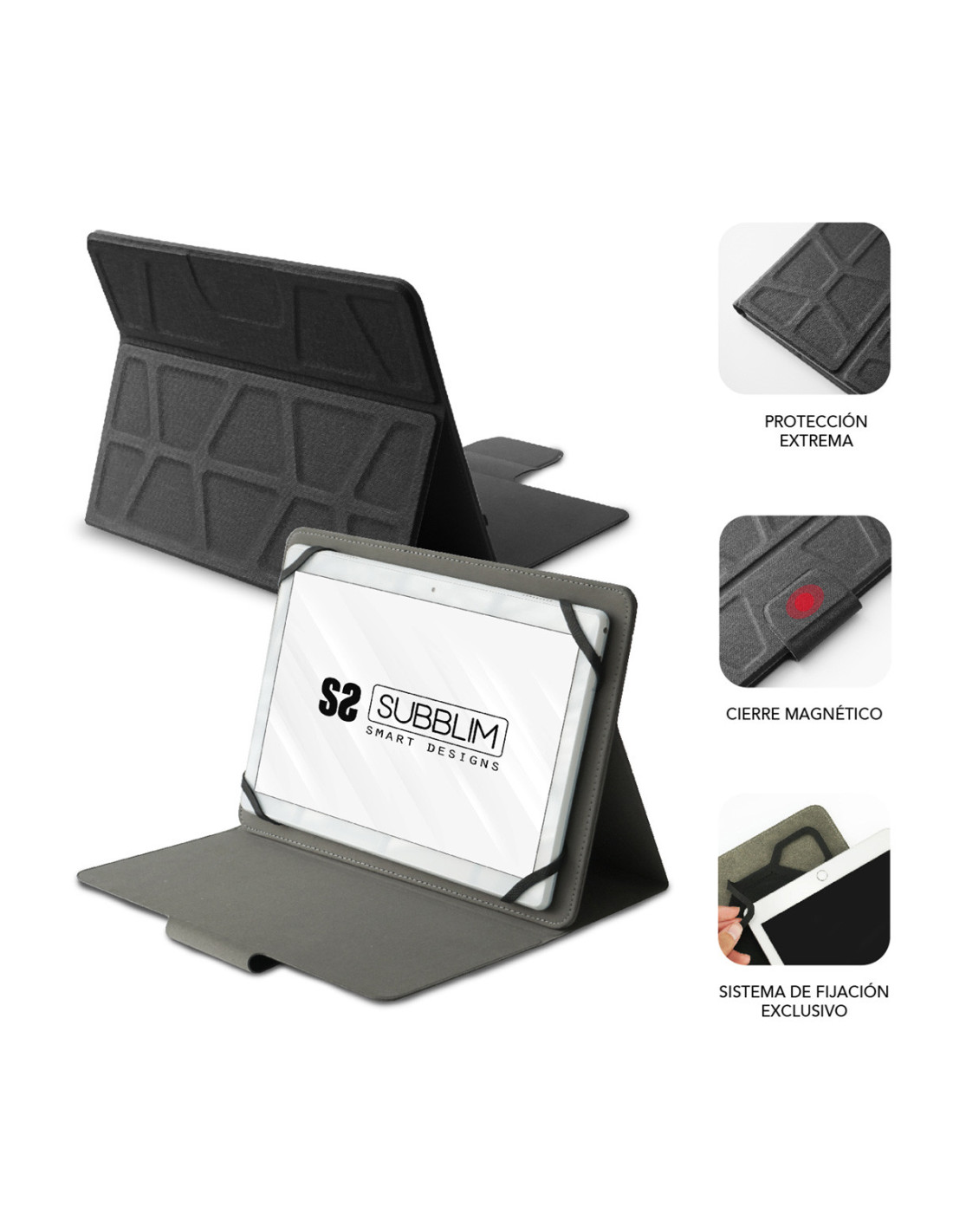 SUBBLIM Funda Tablet alta protección Extreme tablet Case 9,6-11" Black. Tipo de funda: Folio, Marca compatible: Cualquier marca, Compatibilidad: Compatible con todas las tablets del mercado de hasta 11" de tamaño asegurando una máxima protección, Tamaño máximo de pantalla: 27,9 cm (11"), Número de modos de soporte: 3. Peso: 365 g