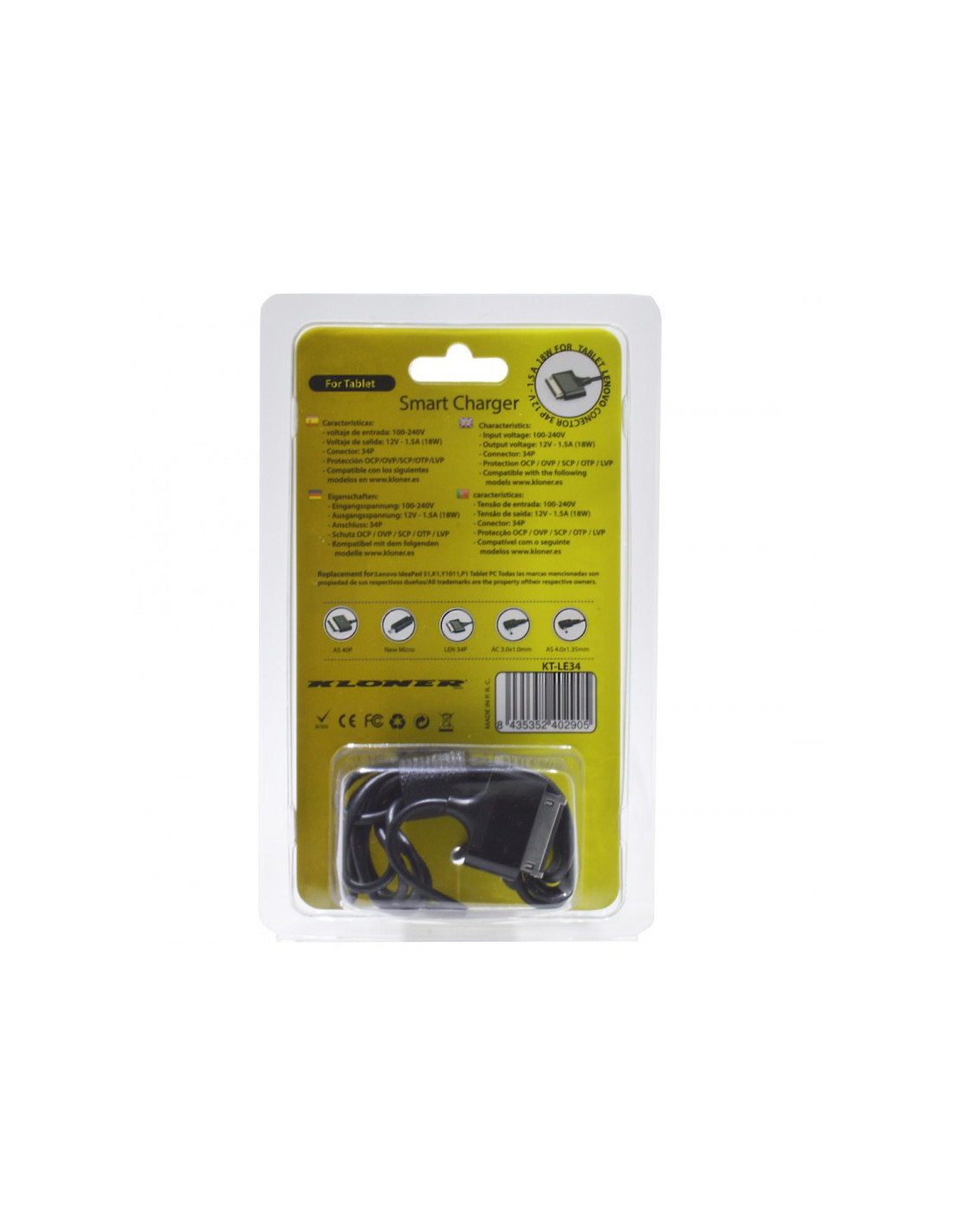 Kloner KT-LE34. Tipo de cargador: Interior, Alimentación: Corriente alterna, Compatibilidad del cargador: Tableta. Voltaje de entrada: 100 - 240 V, Voltaje de salida máximo: 12 V. Funciones de protección de poder: Sobreintensidad, Sobrevoltaje, Cortocircuito. Color del producto: Negro