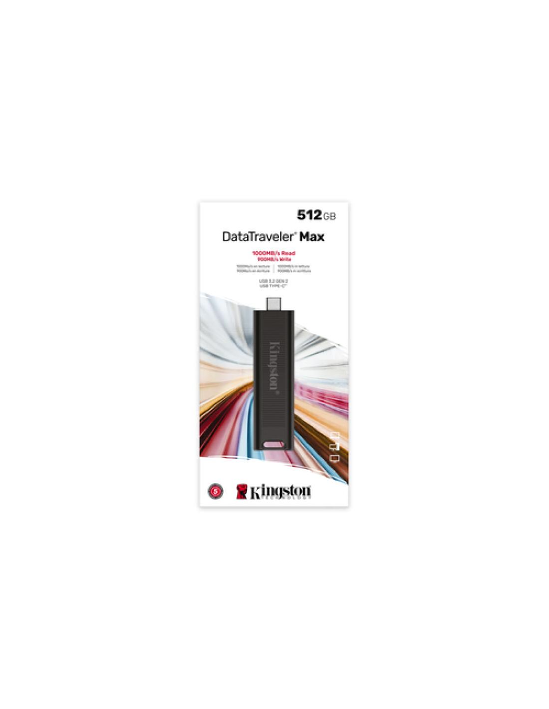 Kingston Technology DataTraveler 512GB Max 1000R/900W USB 3.2 Gen 2. Capacidad: 512 GB, Interfaz del dispositivo: USB Tipo C, Versión USB: 3.2 Gen 2 (3.1 Gen 2), Velocidad de lectura: 1000 MB/s, Velocidad de escritura: 900 MB/s. Factor de forma: Deslizar. Peso: 12 g. Color del producto: Negro