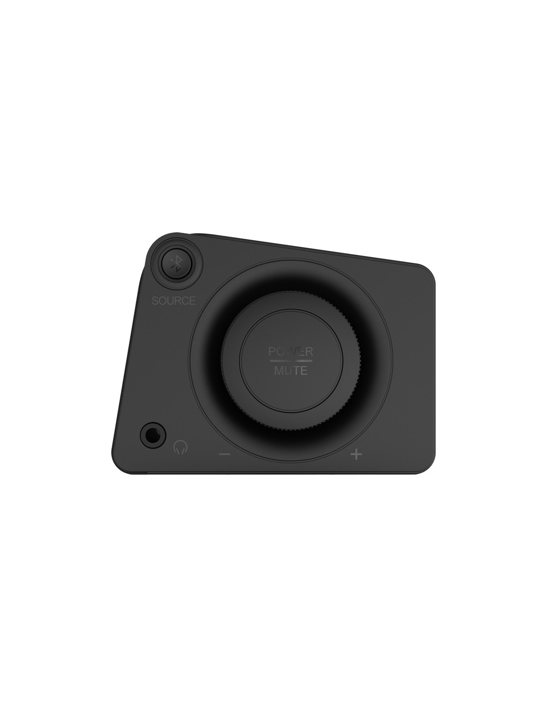 La rueda de control de volumen y el botón de fuente están convenientemente ubicados en el lateral de la barra de sonido para un fácil acceso y un control sin complicaciones.