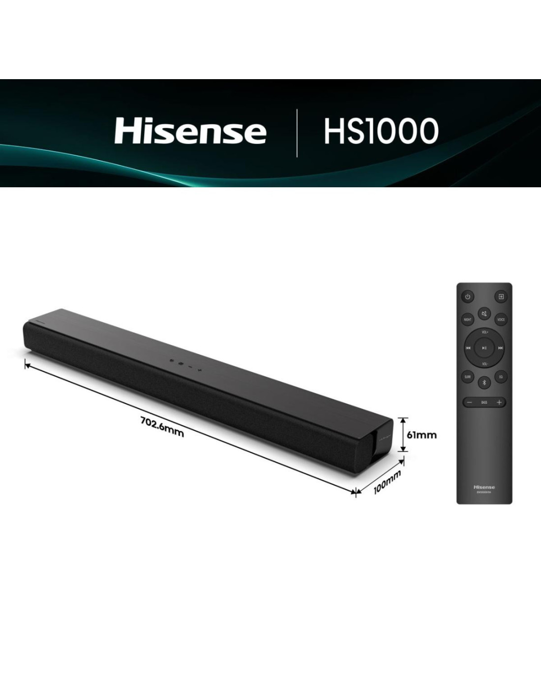 Hisense HS1000. Canales de salida de audio: 2.0 canales, Potencia estimada RMS: 120 W, Decodificadores incorporados: DTS Virtual:X, Dolby Audio, Dolby Digital Plus. Color del producto: Negro. Tecnología de conectividad: Alámbrico. Voltaje de entrada AC: 100-240 V, Frecuencia de entrada AC: 50-60 Hz, Consumo eléctrico de la barra de sonido: 120 W. Ancho: 702 mm, Profundidad: 100 mm, Altura: 57 mm
