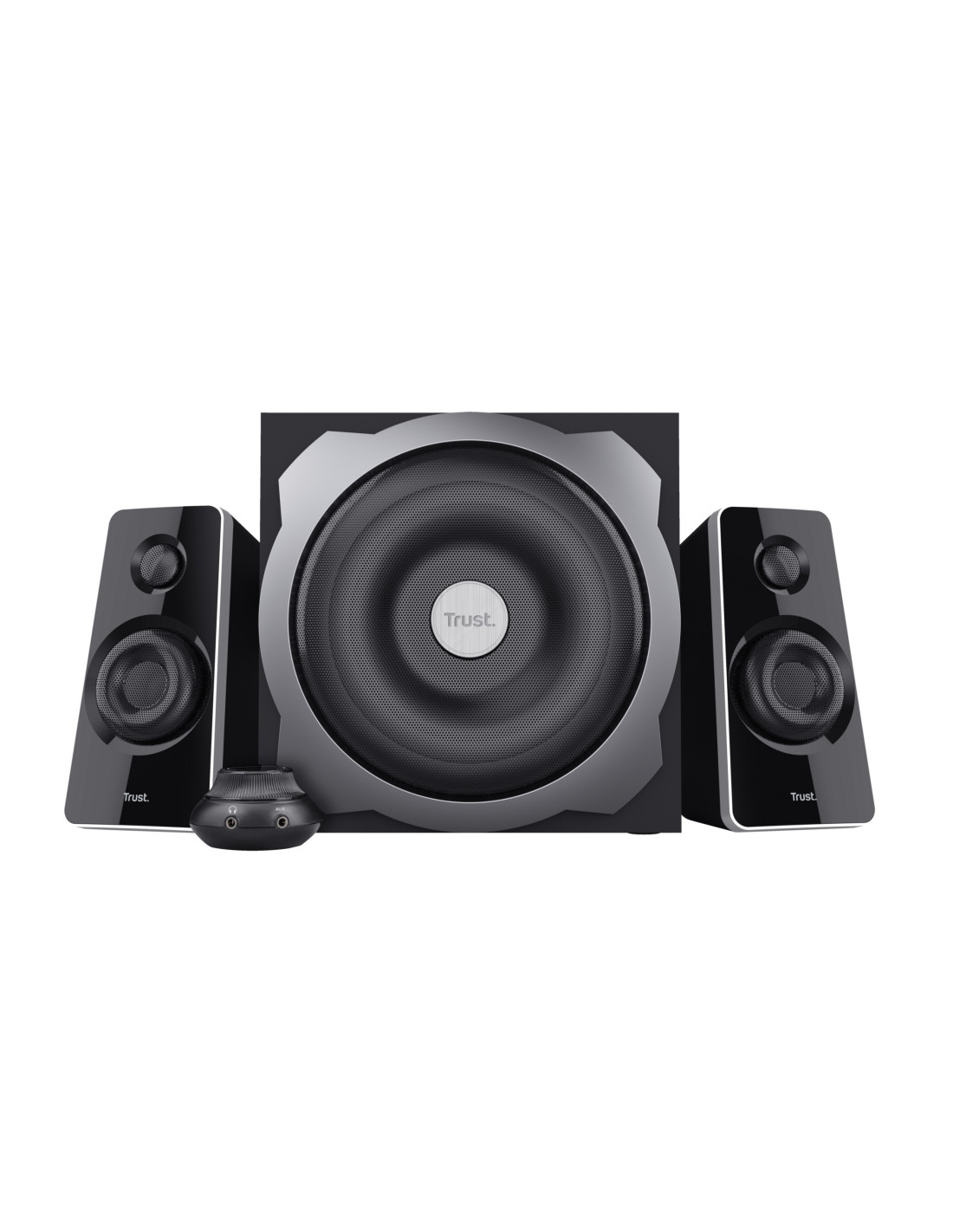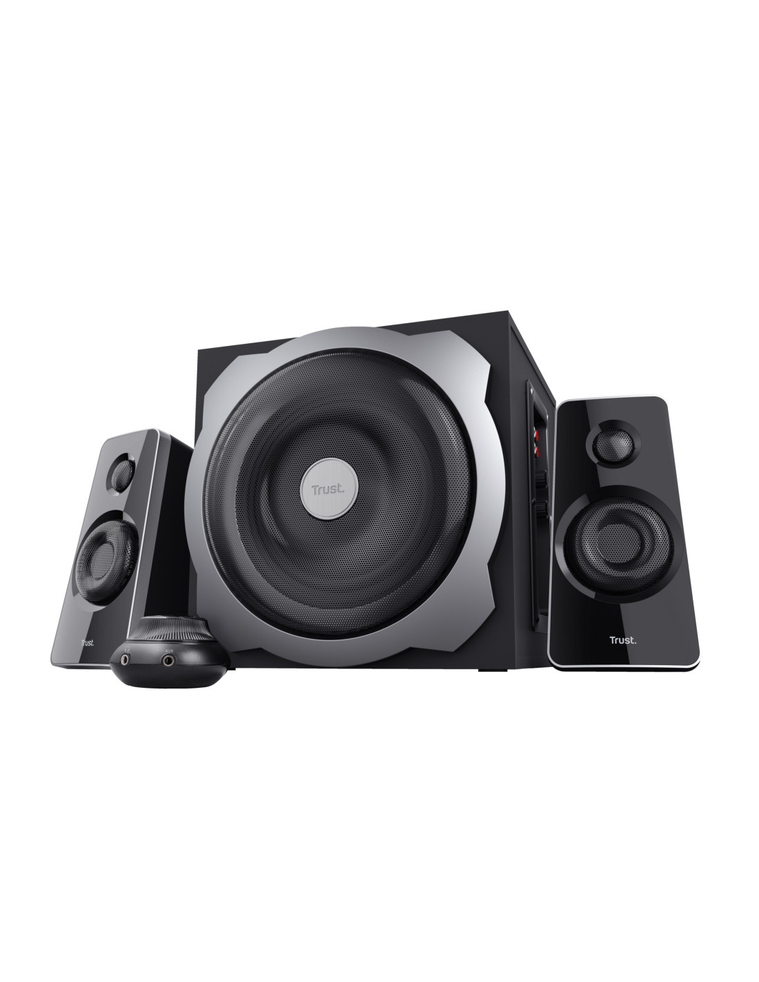 Trust Tytan. Canales de salida de audio: 2.1 canales, Potencia estimada RMS: 60 W, Uso recomendado: Universal. Dimensiones de bocina satelital (AxLxA): 100 x 100 x 200 mm. Dimensiones de subwoofer (AxLxA): 250 x 250 x 250 mm. Fuente de energía: Corriente alterna. Peso: 4,14 kg