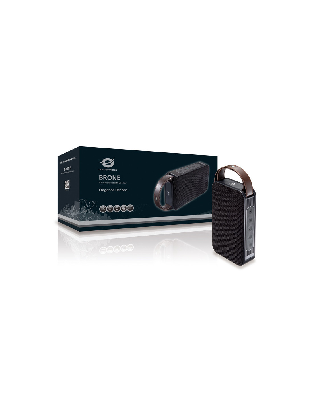 Conceptronic BRONE01B. Potencia estimada RMS: 10 W, Rango de frecuencia: 80 - 20000 Hz, Relación señal/ruido (SNR): 80 dB. Tecnología de conectividad: Inalámbrico y alámbrico. Tipo de producto: Altavoz portátil estéreo, Color del producto: Negro, Bronce, Diseño de producto: Rectángulo. Uso recomendado: Universal, Tarjetas de memoria compatibles: MicroSD (TransFlash). Tipo de batería: Batería integrada, Alimentación: Batería, Capacidad de batería: 2400 mAh