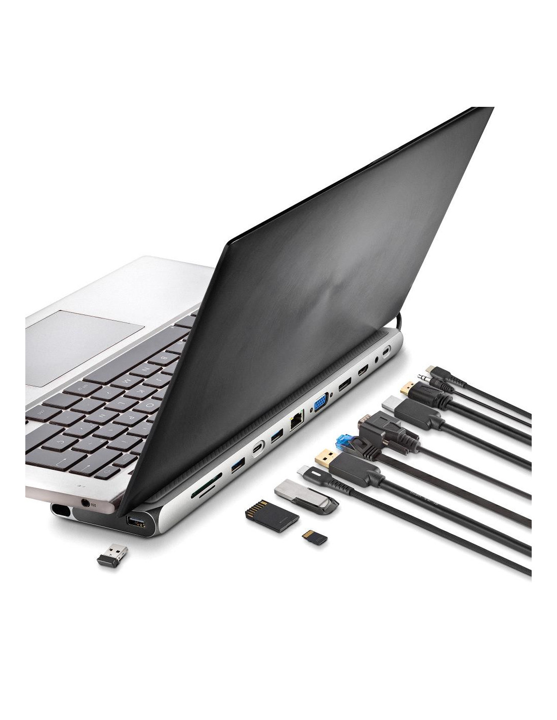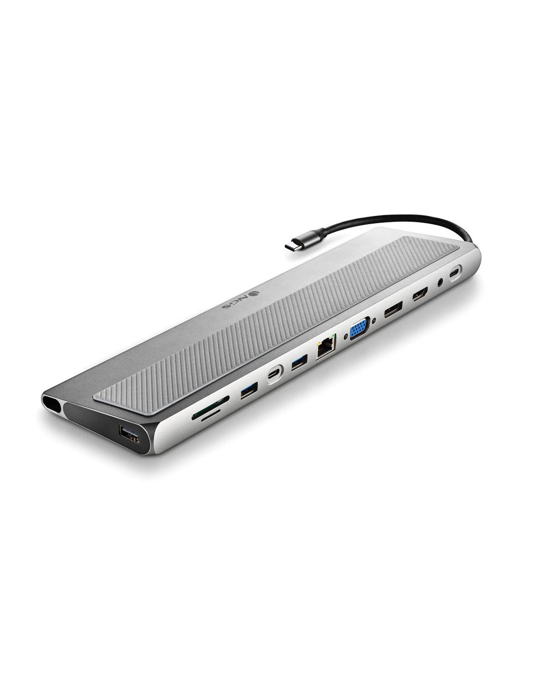 NGS WONDERDOCK 12 PRO. Interfaz de host: USB Tipo C, Interfaces de concentradores: 3ˌ5mm, DisplayPort, HDMI, RJ-45, USB 2.0, USB 3.0, USB Tipo C, VGA, Tarjetas de memoria compatibles: MicroSD (TransFlash), SD. Color del producto: Plata, Material de la carcasa: Aluminio, Policarbonato (PC), Entrega de energía USB (USB Power Delivery) de hasta: 100 W. Tipo de interfaz ethernet: Gigabit Ethernet, Ethernet LAN, velocidad de transferencia de datos: 10,100,1000 Mbit/s. Ancho: 273 mm, Profundidad: 80 mm, Altura: 17 mm. Cantidad por paquete: 1 pieza(s), Ancho del paquete: 105 mm, Profundidad del paquete: 25 mm