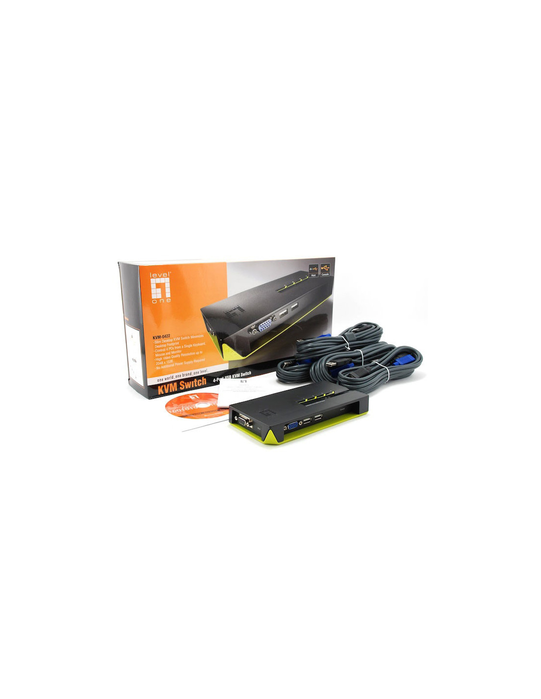 Descripción General del ProductoEl Switch KVM de 4 Puertos USB, KVM-0422 de LevelOne, ofrece a los usuarios un switch KVM fácil de instalar, permitiéndoles manejar cuatro computadores desde un solo monitor, teclado y Mouse.