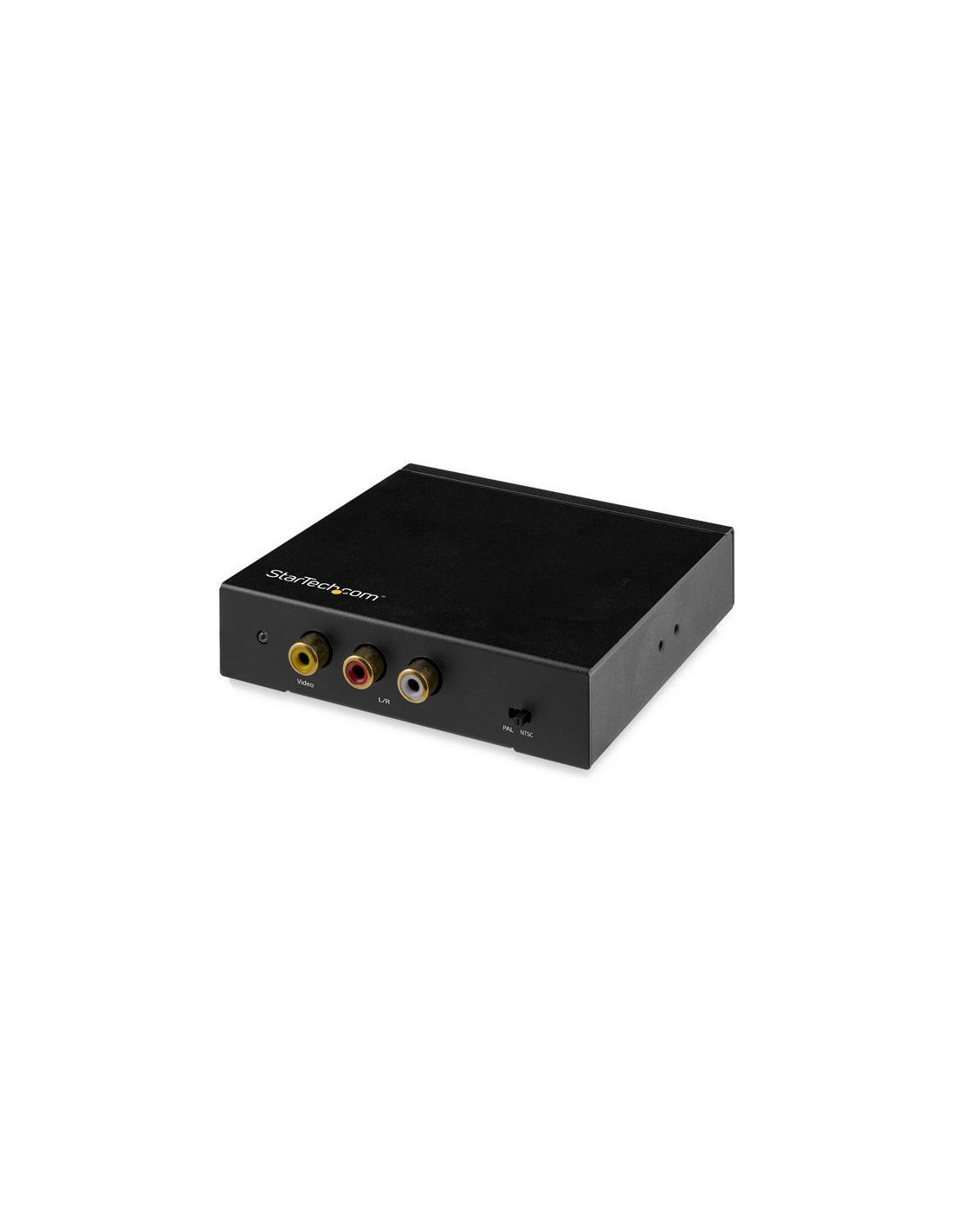 StarTech.com Caja Convertidora HDMI a RCA con Audio. Tipo de convertidor: Conversor de vídeo activo, Color del producto: Negro, Certificación: REACH, FCC. Máxima resolución de video: 1920 x 1080 Pixeles, Resoluciones de video: 640 x 480,800 x 600,1920 x 1080, Formato de vídeo soportado: 480p, 576p, 720p, 1080p. Canales de salida de audio: 2.0 canales, Frecuencia de muestreo de audio: 48 kHz. Interfaz de host: HDMI. Voltaje de entrada: 100 - 240 V, Voltaje de operación: 5 V, Corriente de operación: 2 A
