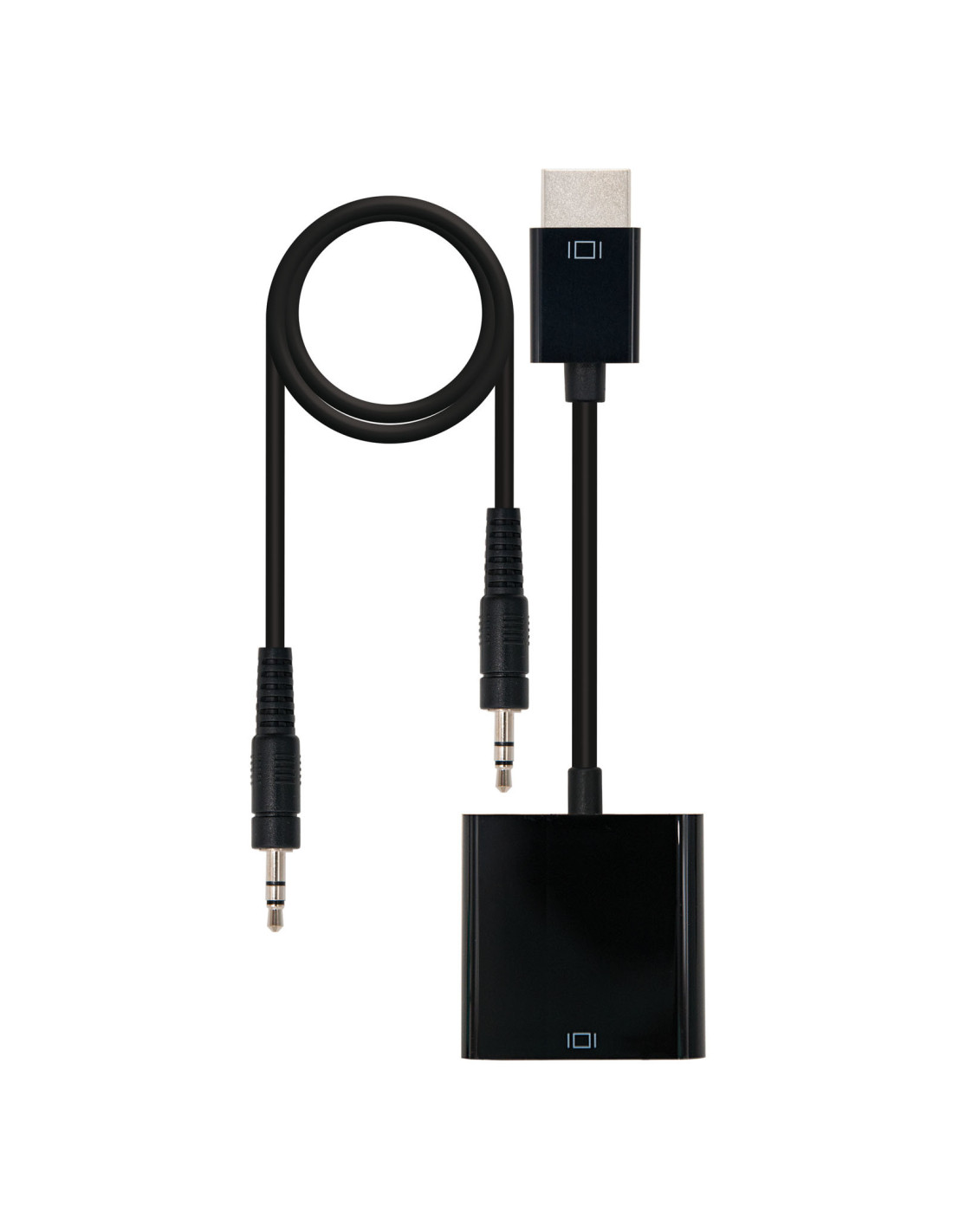 - Conversor HDMI a SVGA y audio con conector HDMI macho en un extremo y conector D-sub HDB15 hembra y Jack 3.5 hembra en el otro.