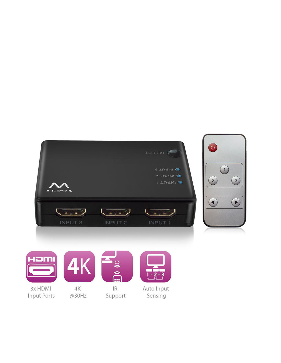 Ewent EW3730. Tipo de puerto de vídeo: HDMI. Color del producto: Negro, Formato de vídeo soportado: 2160p, Máxima resolución: 3840 x 2160 Pixeles. Tipo de embalaje: Box, Ancho del paquete: 125 mm, Profundidad del paquete: 25 mm. Cables incluidos: IR