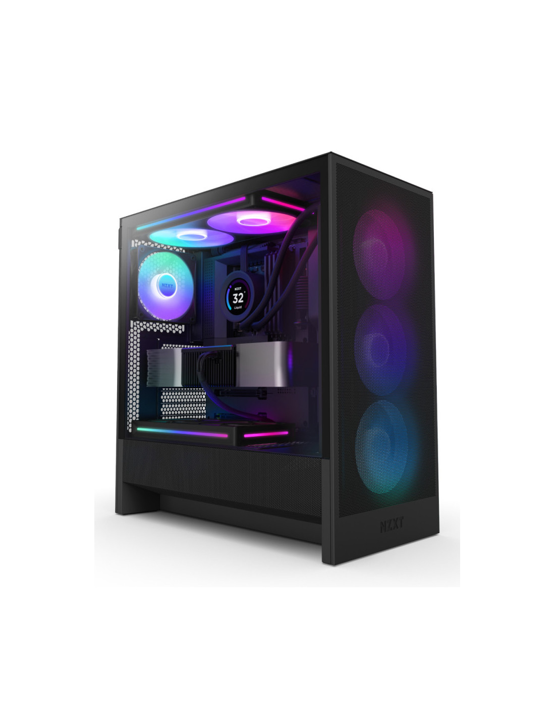 NZXT H5 Flow RGB. Factor de forma: Midi Tower, Tipo: PC, Color del producto: Negro. Ventiladores frontales instalados: 3x 120 mm, Diámetro de ventiladores frontales soportados: 120,140 mm, Ventiladores traseros instalados: 1x 120 mm. Tamaños de disco duro soportados: 2.5,3.5". Ancho: 225 mm, Profundidad: 430 mm, Altura: 465 mm. Nivel de ruido: 23,3 dB, Conector de ventilador: 3 pines