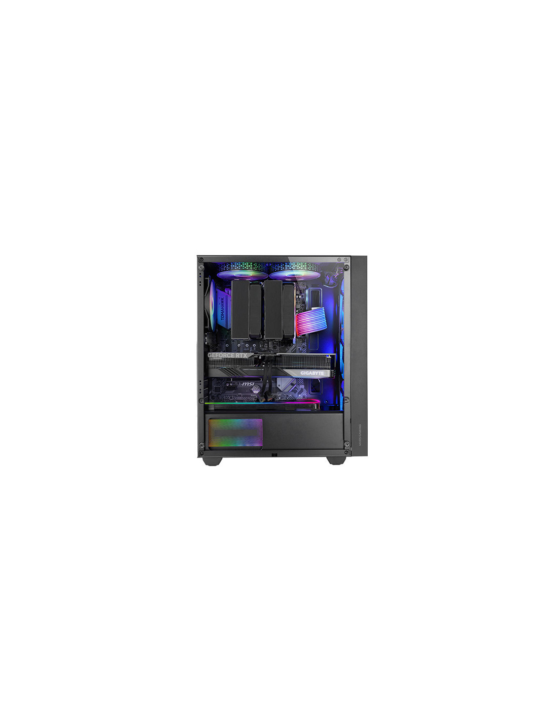 La caja MC-AIR combina alto rendimiento y diseño con su elegante frontal Mesh y 4 ventiladores FRGB Rainbow de 120mm preinstalados (3 en el panel frontal y 1 en la parte trasera). Su ventana lateral de cristal templado permite exhibir tu configuración con estilo, mientras su diseño de doble cámara optimiza el flujo de aire para mantener tus componentes en temperaturas óptimas.