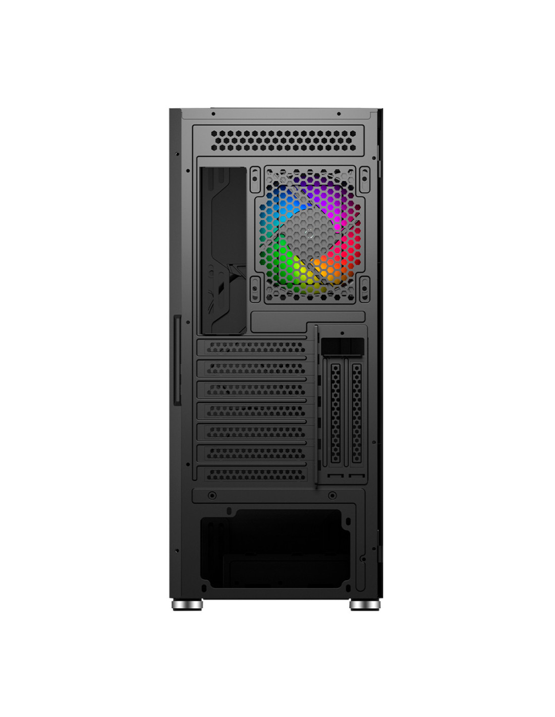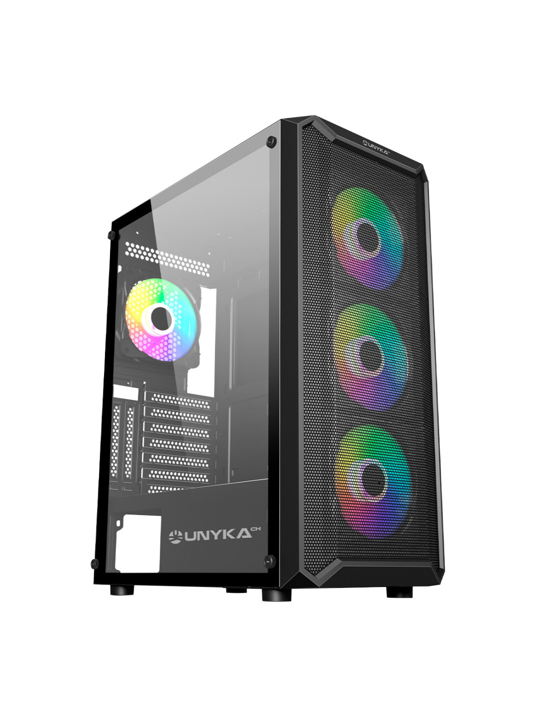 La caja de ordenador ARMOR 3Gen de UNYKAch viene equipada con cuatro ventiladores ARGB, lo que proporciona una excelente capacidad de enfriamiento para los componentes internos del ordenador. Además, el cristal templado en el lateral de la caja permite ver el interior del ordenador y el diseño de los componentes.
