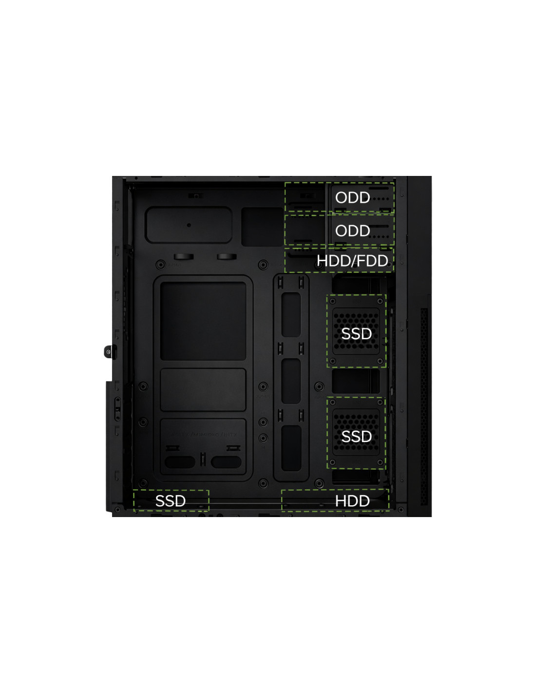 Compatible con placas base ATX, microATX y miniITX, refrigeradores de CPU de hasta 140mm y fuente de alimentación ATX.