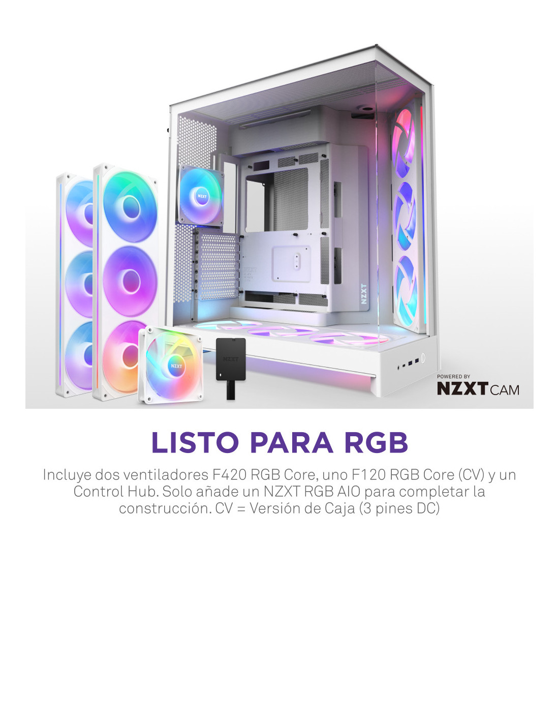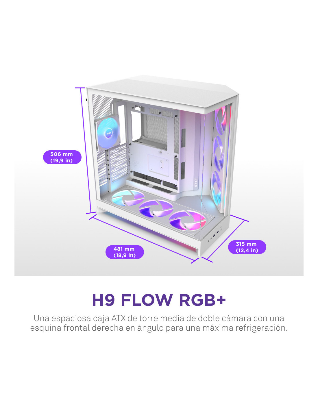 NZXT H9 Flow RGB+. Factor de forma: Midi Tower, Tipo: PC, Color del producto: Blanco. Ventiladores frontales instalados: 3x 140 mm, Diámetro de ventiladores frontales soportados: 120,140 mm, Ventiladores traseros instalados: 1x 120 mm. Tamaños de disco duro soportados: 2.5,3.5". Ancho: 315 mm, Profundidad: 481 mm, Altura: 506 mm