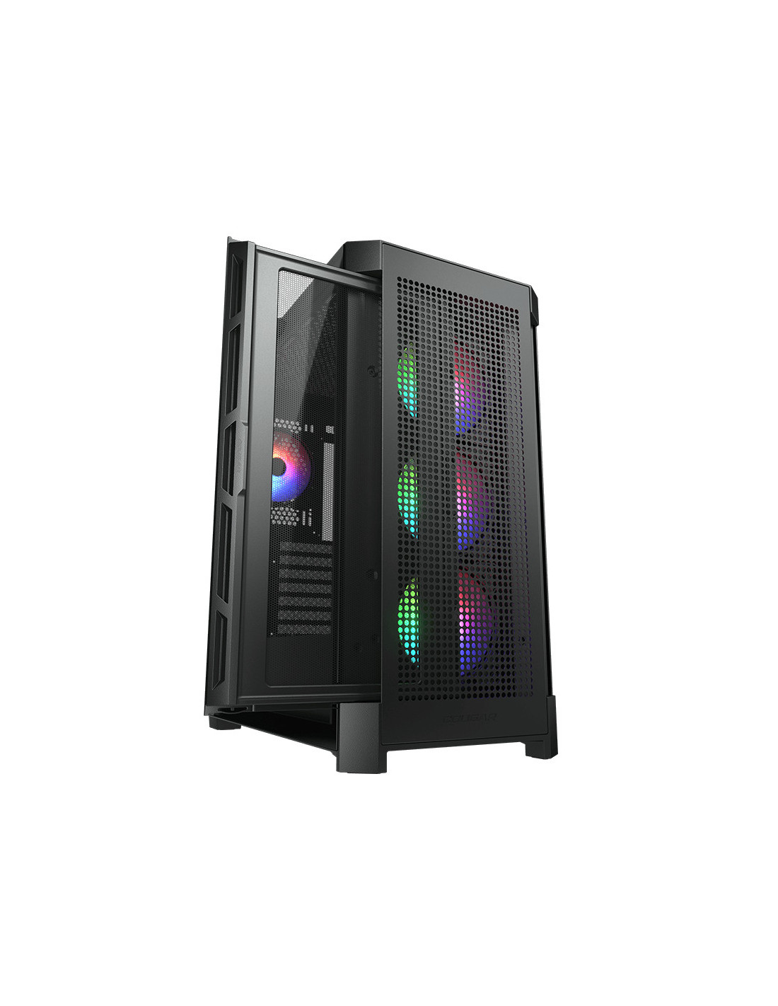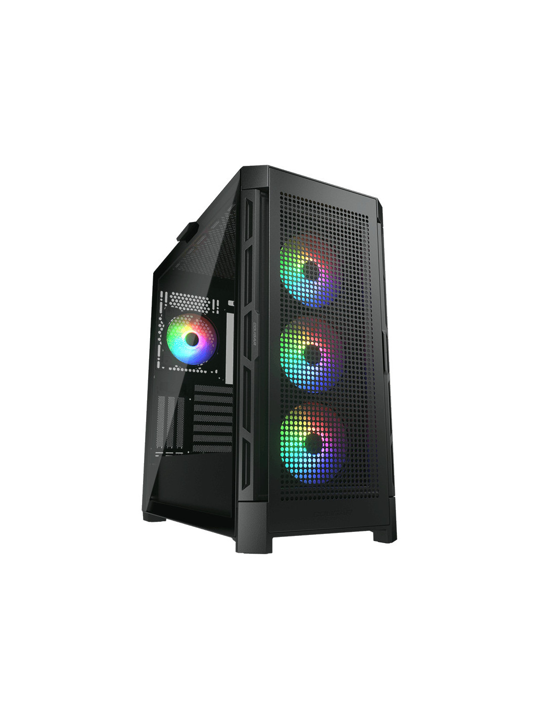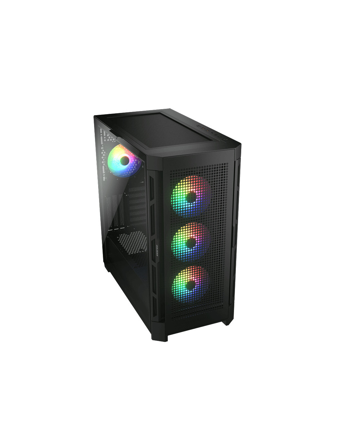 COUGAR CGR-5AD1B-AIR-RGB. Factor de forma: Midi Tower, Tipo: PC, Color del producto: Negro. Ventiladores frontales instalados: 3x 120 mm, Diámetro de ventiladores frontales soportados: 120,140 mm, Ventiladores traseros instalados: 1x 120 mm. Tamaños de disco duro soportados: 2.5,3.5", Factor de forma de disco SSD: 2.5". Ancho: 240 mm, Profundidad: 465 mm, Altura: 496 mm. Ancho del paquete: 313 mm, Profundidad del paquete: 567 mm, Altura del paquete: 567 mm