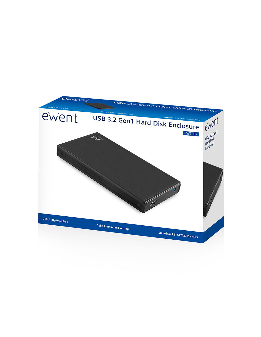 Ewent EW7032. Tipo de producto: Carcasa de disco duro/SSD. Número de unidades de almacenamiento compatibles: 1, Tamaño de la unidad de almacenamiento: 2.5", Interfaces de disco de almacenamiento soportados: Serial ATA III. Velocidad de transferencia de datos: 5 Gbit/s. Color del producto: Negro. Conector USB: Micro-USB A