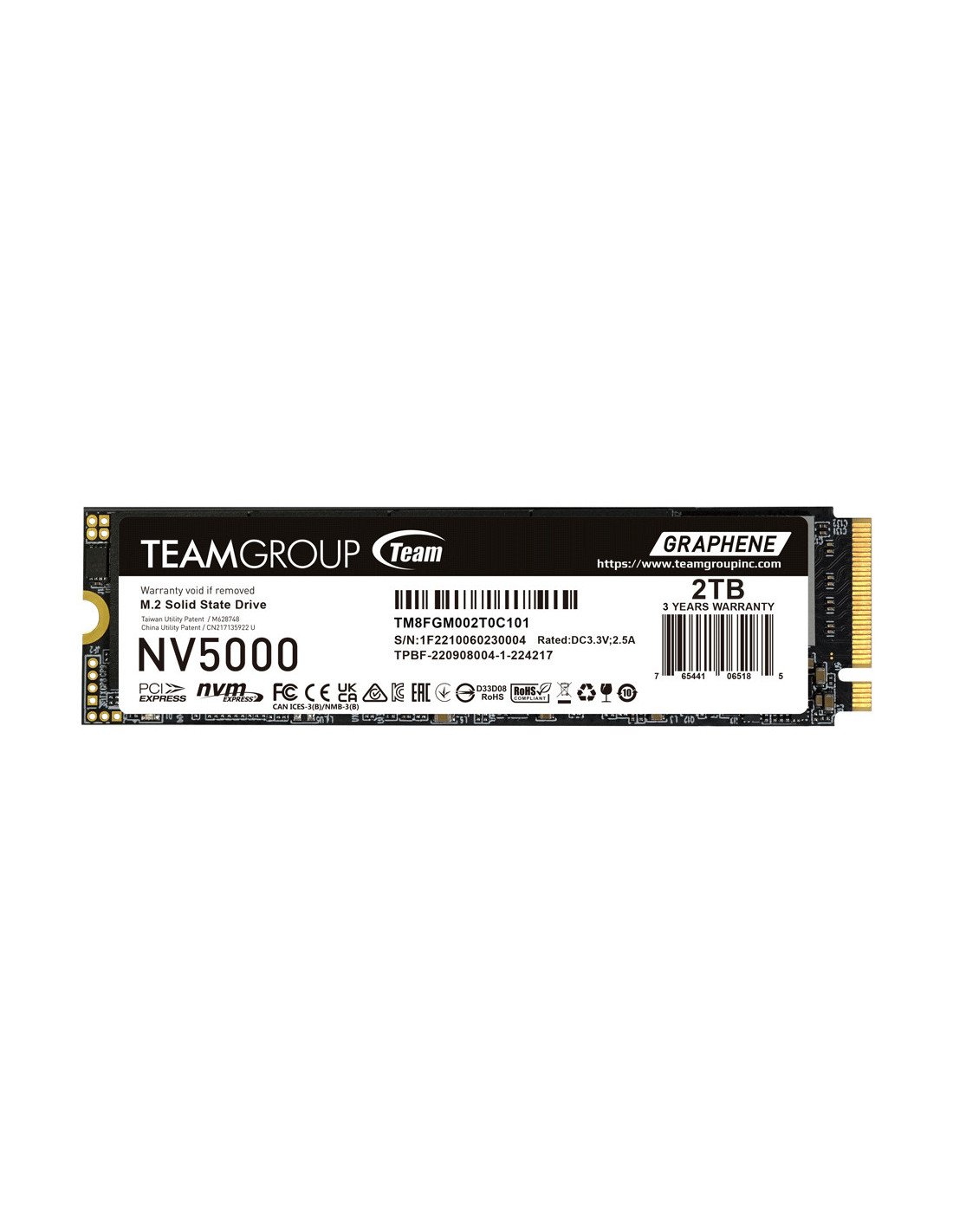 Team Group NV5000. SDD, capacidad: 2 TB, Factor de forma de disco SSD: M.2, Velocidad de lectura: 5000 MB/s, Velocidad de escritura: 3000 MB/s, Componente para: PC/ordenador portátil