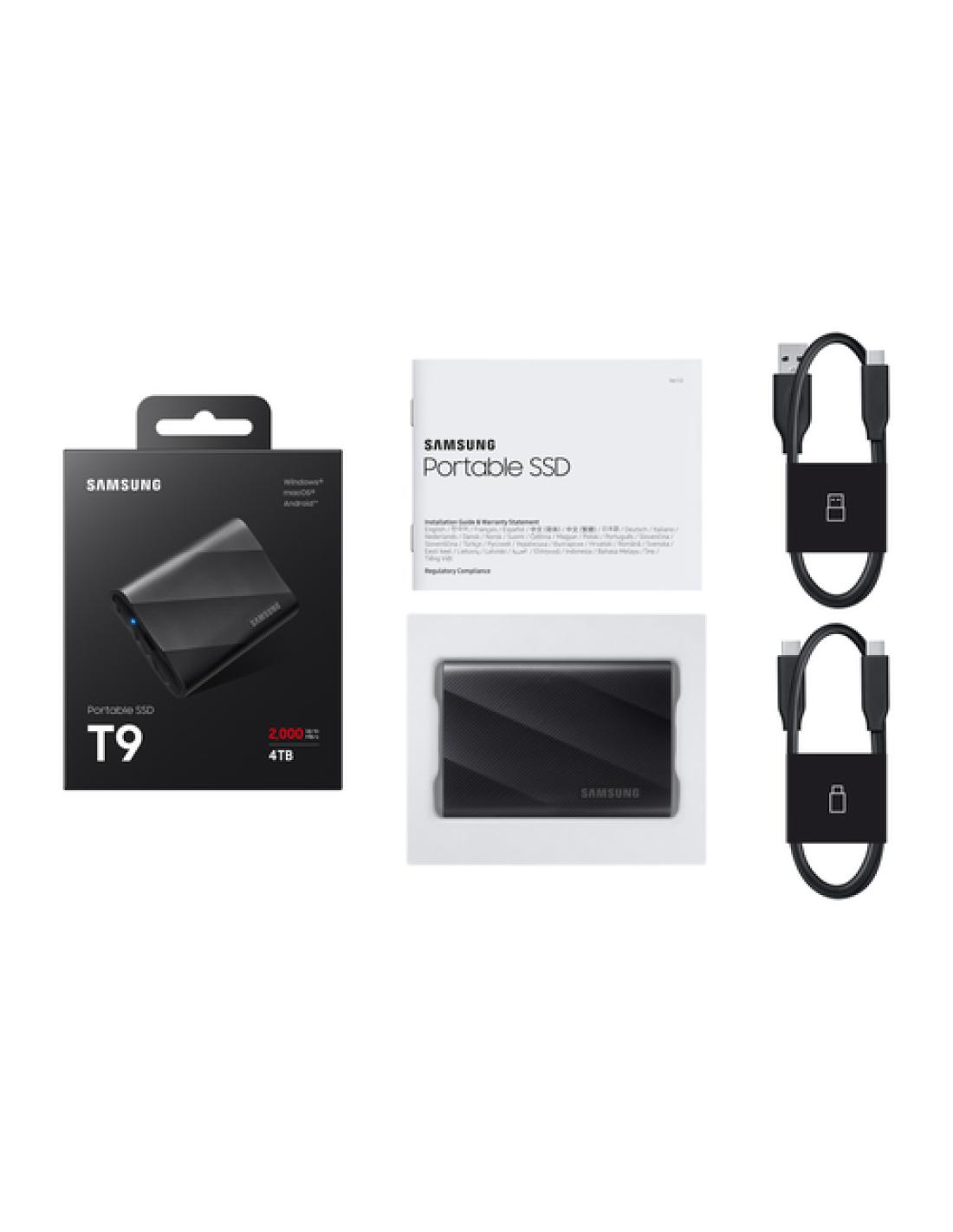 Samsung MU-PG4T0B. SDD, capacidad: 4 TB. Conector USB: USB Tipo C, Versión USB: 3.2 Gen 2 (3.1 Gen 2). Velocidad de lectura: 2000 MB/s, Velocidad de escritura: 2000 MB/s. Protección mediante contraseña. Color del producto: Negro