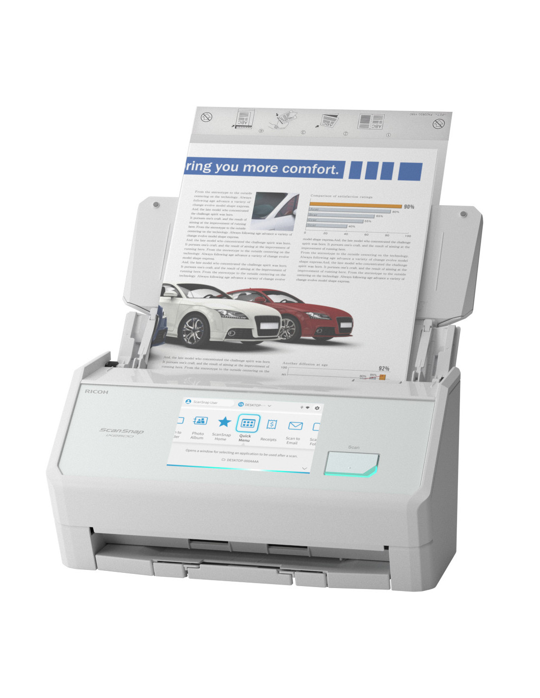 Ricoh ScanSnap IX2500. Tamaño máximo de escaneado: 297 x 432 mm, Resolución óptica de escáner: 600 x 600 DPI, Velocidad de escaneo ADF (b/n, A4): 45 ppm. Tipo de escaneado: Escáner con alimentador automático de documentos (ADF), Color del producto: Blanco, Diagonal de la pantalla: 12,7 cm (5"). Tipo de sensor: Dual CIS, Fuentes de luz: LED RGB, Formatos de archivo para escaneo: JPEG, PDF. Capacidad del alimentador automático de documentos: 100 hojas. Tamaño máximo de papel ISO A-series: A4, Tipos de media soportados de escaneo: Tarjeta de visita, Papel fotográfico, Papel normal, Post Card(JPN), ISO tamaño de serie A (A0...A9): A3, A4, A5, A6