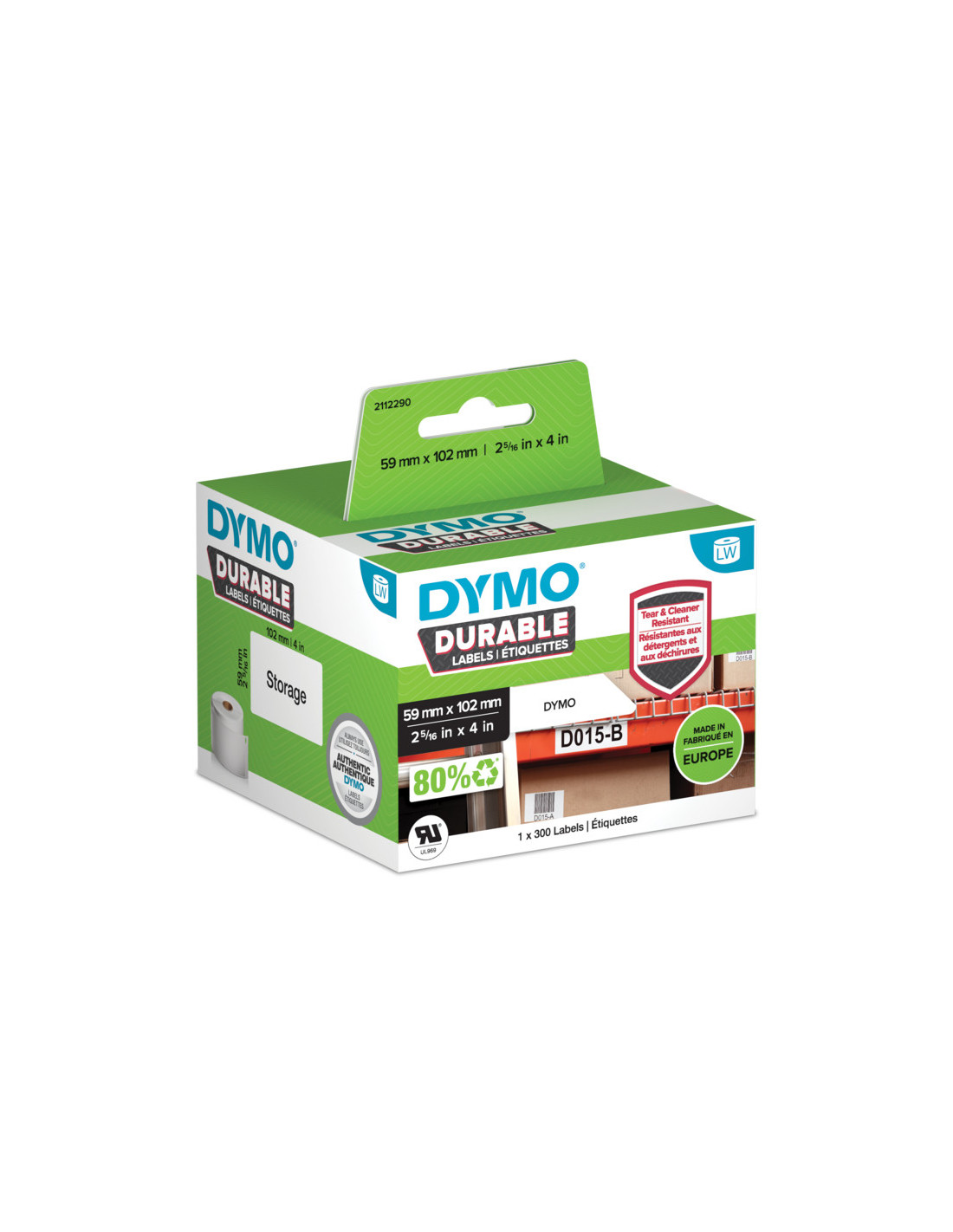DYMO Durable. Color del producto: Blanco, Tipo de etiqueta: Etiqueta para impresora autoadhesiva, Material: Polipropileno (PP). Anchura de etiqueta: 10,2 cm, Altura de etiqueta: 5,9 cm, Peso: 320 g. Etiquetas por paquete: 300 pieza(s), Etiquetas por rollo: 300 pieza(s). País de origen: Bélgica