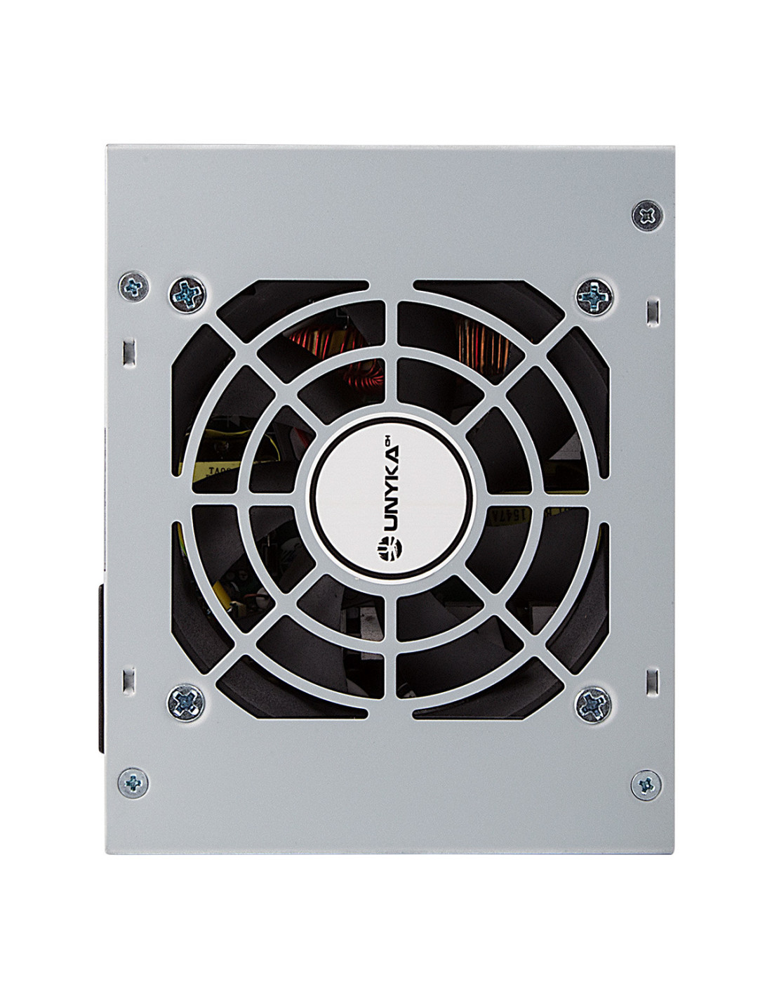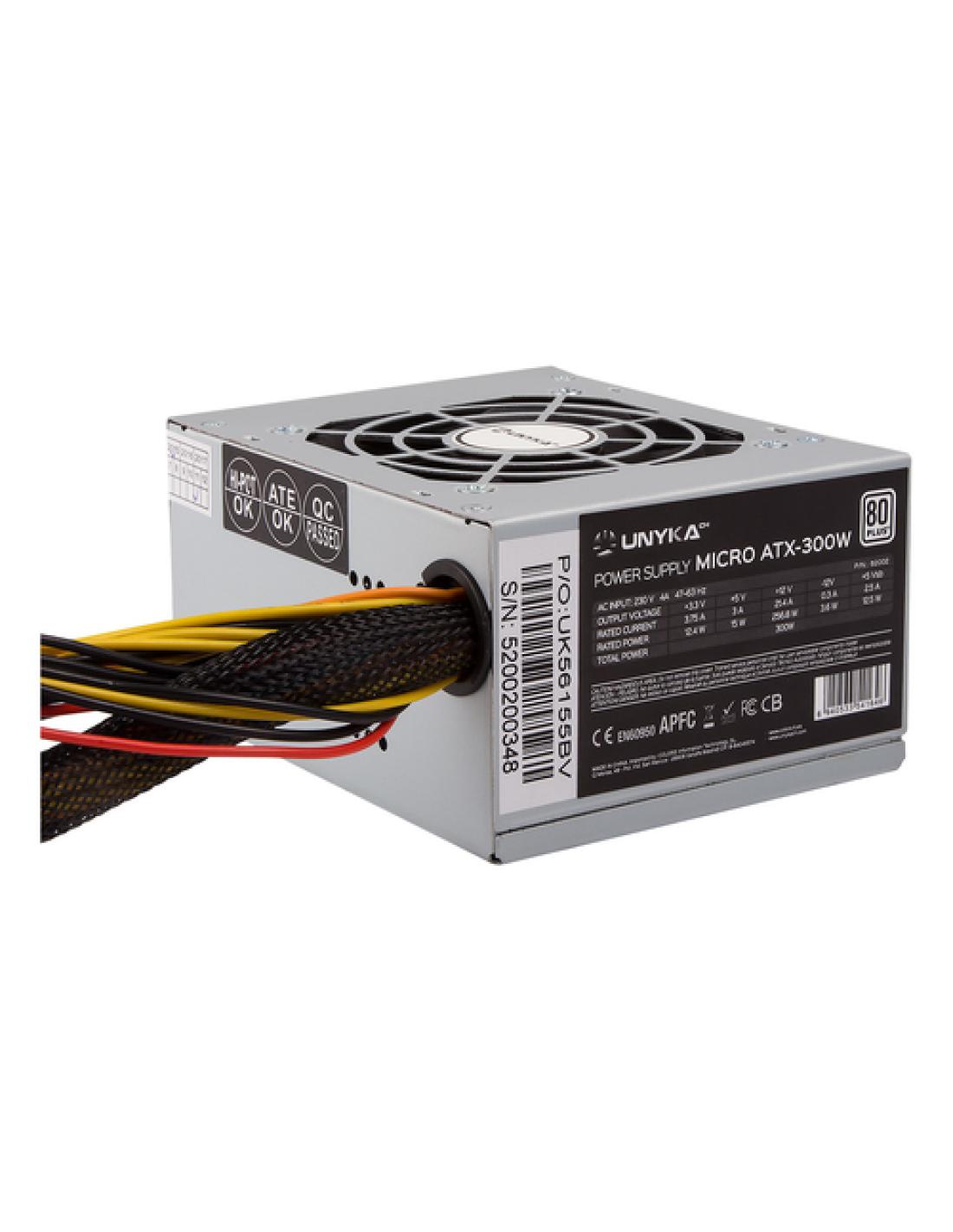 UNYKAch SFX 300W. Potencia total: 300 W, Voltaje de entrada AC: 230 V, Frecuencia de entrada AC: 47 - 63 Hz. Alimentador de energía para tarjeta madre: 20+4 pin ATX, Longitud del cable de alimentación de la placa base: 38 cm, Longitud del cable de alimentación SATA: 530 mm. Utilizar con: PC/servidor, Factor de forma de fuente de alimentación (PSU): SFX, Nivel de ruido: 28 dB. Color del producto: Plata, Tipo de enfriamiento: Activo, Diámetro de ventilador: 8 cm. Certificados de conformidad: RoHS, Certificación: EUP 2013 / ErP 617/2013 / TÜV / CE