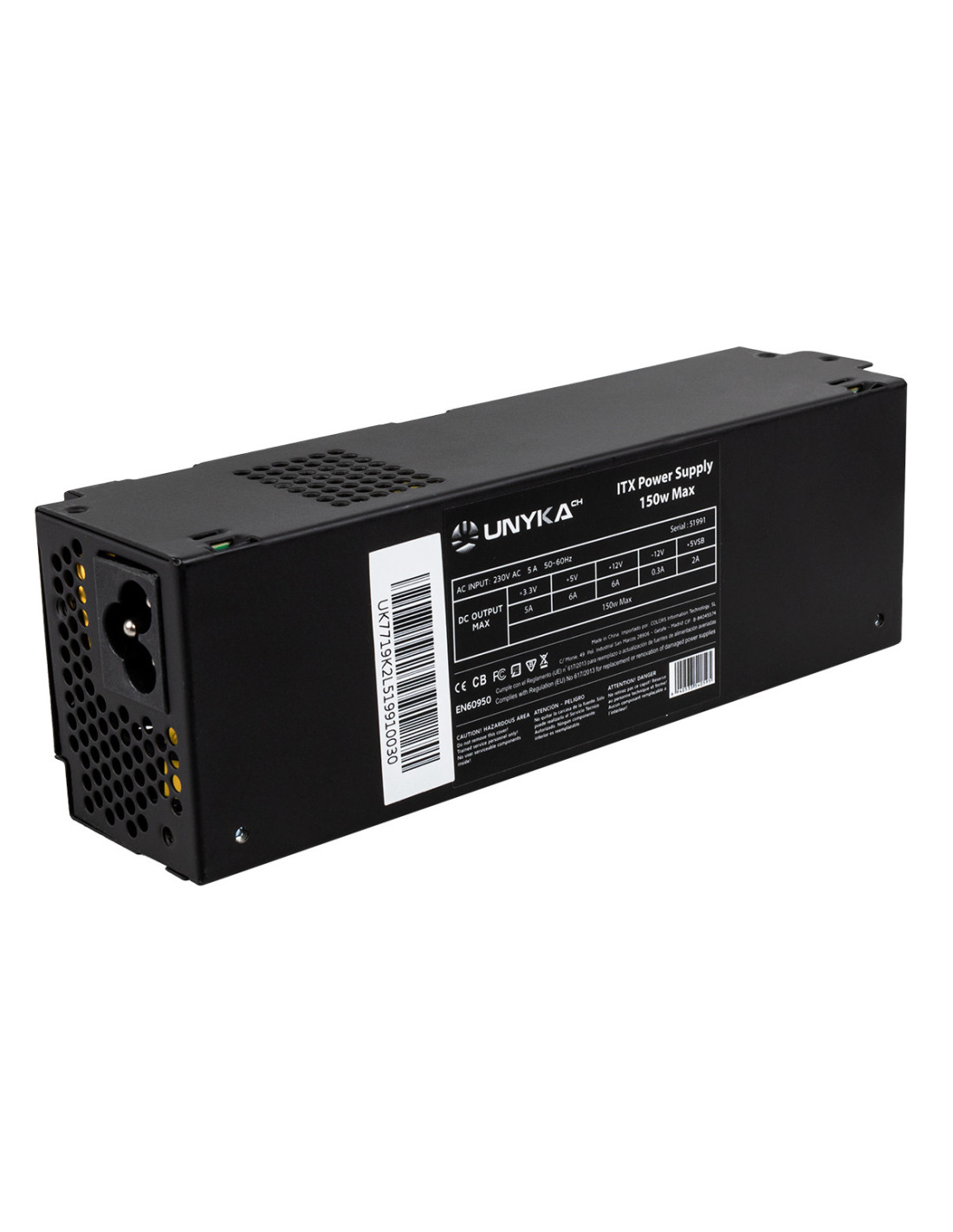 UNYKAch ITX 150. Potencia total: 150 W, Voltaje de entrada AC: 230 V, Frecuencia de entrada AC: 50 - 60 Hz. Alimentador de energía para tarjeta madre: 20+4 pin ATX, Longitud del cable de alimentación de la placa base: 28 cm, Longitud del cable de alimentación SATA: 480 mm. Utilizar con: PC, Factor de forma de fuente de alimentación (PSU): Flex ATX, Formas de factor de tarjeta madre soportadas: Mini-ITX. Color del producto: Negro, Tipo de enfriamiento: Activo, Diámetro de ventilador: 4 cm. Certificados de conformidad: RoHS, Certificación: EN60950, CE, TÜV