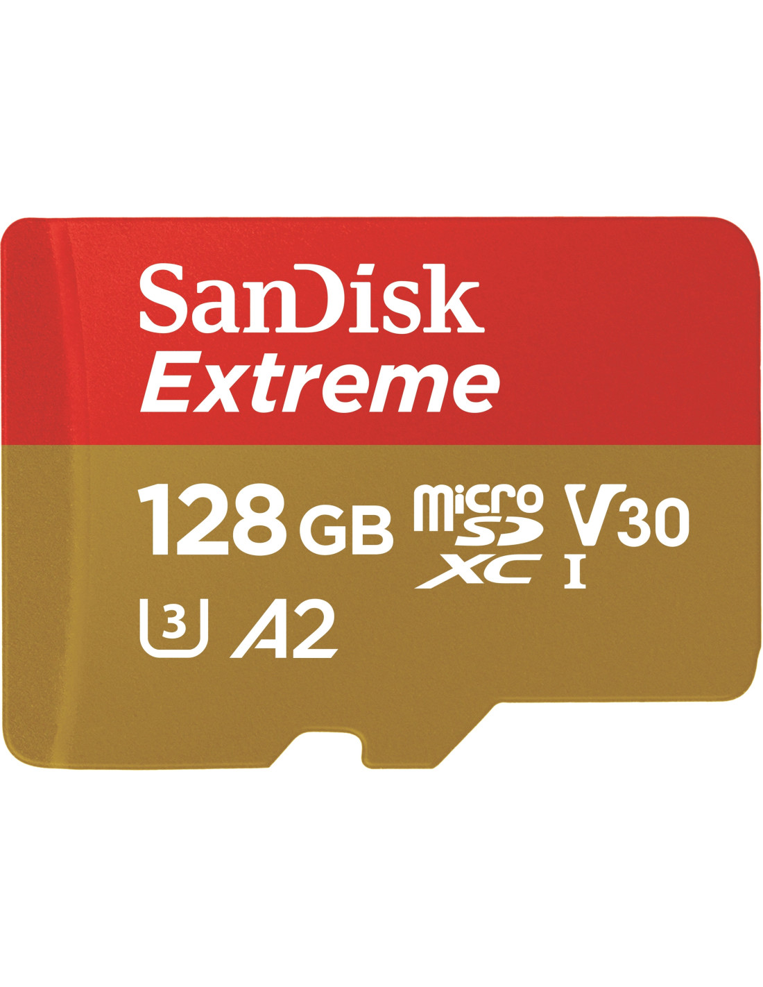 SanDisk Extreme. Capacidad: 128 GB, Tipo de tarjeta flash: MicroSDXC, Velocidad de lectura: 160 MB/s, Velocidad de escritura: 90 MB/s, Clase de velocidad UHS: Class 3 (U3), Clase de velocidad de vídeo: V30. Color del producto: Oro, Rojo