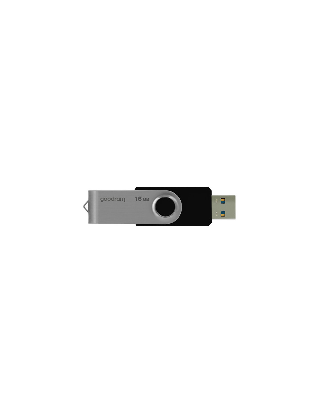 Goodram UTS3. Capacidad: 16 GB, Interfaz del dispositivo: USB tipo A, Versión USB: 3.2 Gen 1 (3.1 Gen 1), Velocidad de lectura: 60 MB/s, Velocidad de escritura: 20 MB/s. Factor de forma: Girar. Peso: 15 g. Color del producto: Negro