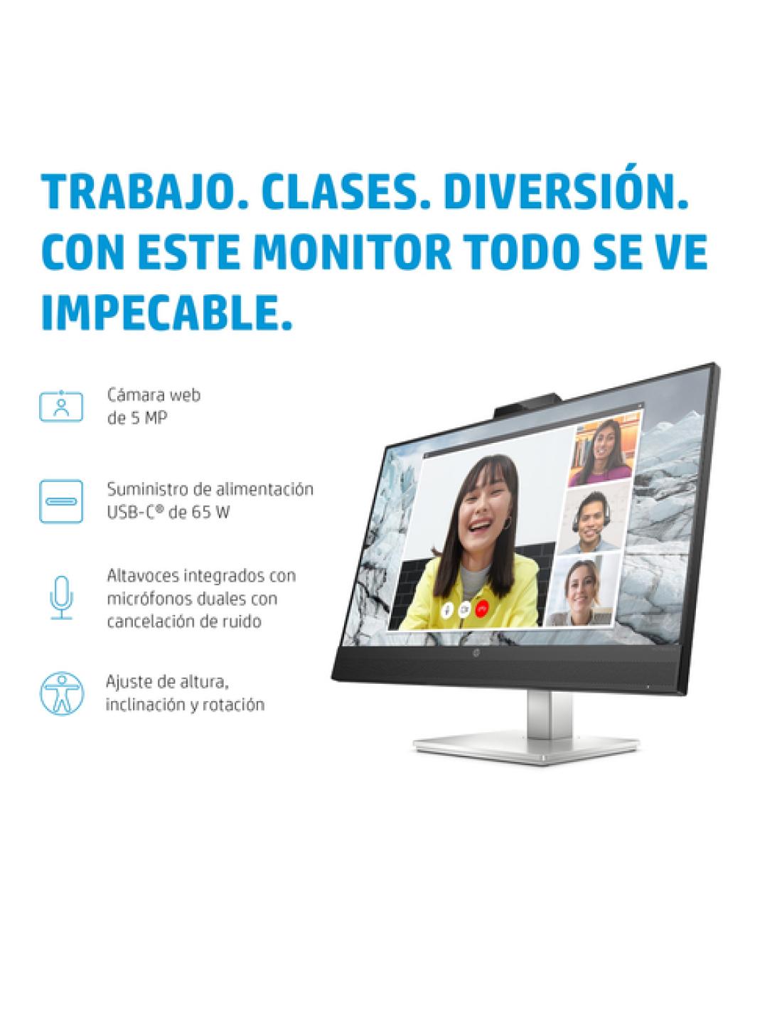 HP E-Series Monitor de conferencias USB-C QHD E27m G4. Diagonal de la pantalla: 68,6 cm (27"), Resolución de la pantalla: 2560 x 1440 Pixeles, Tipo HD: Quad HD, Tecnología de visualización: LCD, Superficie de la pantalla: Mate, Tiempo de respuesta: 5 ms, Relación de aspecto nativa: 16:9, Ángulo de visión, horizontal: 178°, Ángulo de visión, vertical: 178°. Altavoces incorporados. Conector USB incorporado, Versión de conector USB: 3.2 Gen 1 (3.1 Gen 1). montaje VESA, Ajustes de altura. Color del producto: Negro