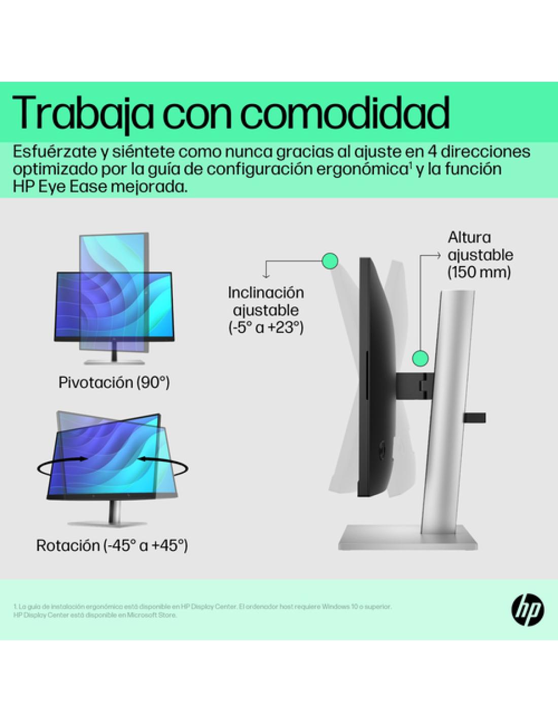 HP E-Series Monitor FHD E22 G5. Diagonal de la pantalla: 54,6 cm (21.5"), Resolución de la pantalla: 1920 x 1080 Pixeles, Tipo HD: Full HD, Tecnología de visualización: LCD, Superficie de la pantalla: Mate, Tiempo de respuesta: 5 ms, Relación de aspecto nativa: 16:9, Ángulo de visión, horizontal: 178°, Ángulo de visión, vertical: 178°. Conector USB incorporado, Versión de conector USB: 3.2 Gen 1 (3.1 Gen 1). montaje VESA, Ajustes de altura. Color del producto: Negro, Plata