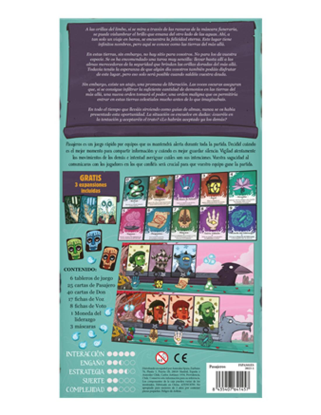 Pasajeros es un juego rápido por equipos que os mantendrá alerta durante toda la partida. Decidid cuándo es el mejor momento para compartir información y cuándo es mejor guardar silencio. Vigilad atentamente los movimientos de los demás e intentad averiguar cuáles son sus intenciones. Vuestra sagacidad al comunicaros con los jugadores en los que confiéis será crucial para que vuestro equipo gane la partida.