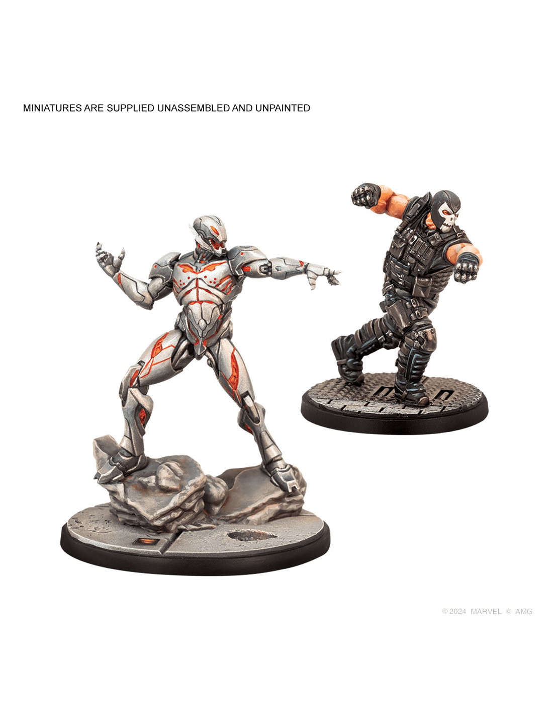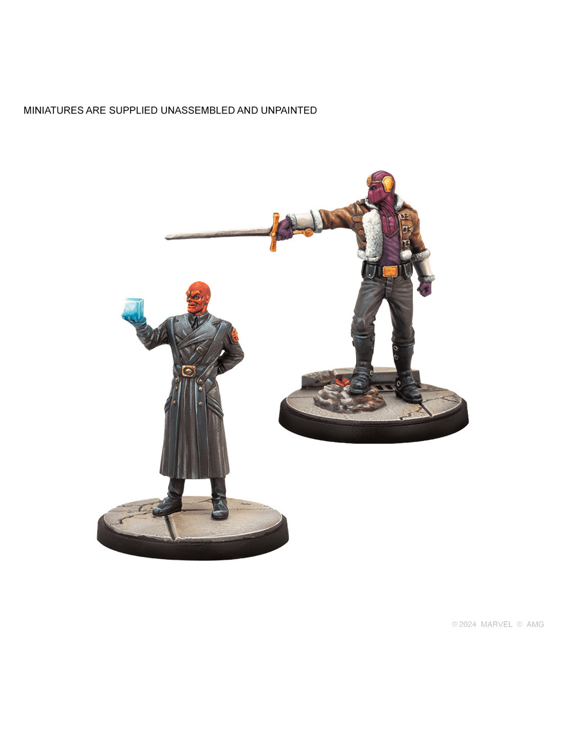1 miniatura de Cráneo Rojo , 1 miniatura de Barón Zemo, 1 miniatura de Calavera, 1 miniatura de Ultrón, 4 peanas, 4 cartas de atributos de Personaje, 3 cartas de Tácticas de equipo