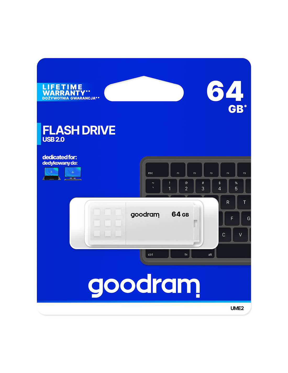 Goodram UME2. Capacidad: 64 GB, Interfaz del dispositivo: USB tipo A, Versión USB: 2.0, Velocidad de lectura: 20 MB/s, Velocidad de escritura: 5 MB/s. Factor de forma: Tapa. Peso: 9 g. Color del producto: Blanco