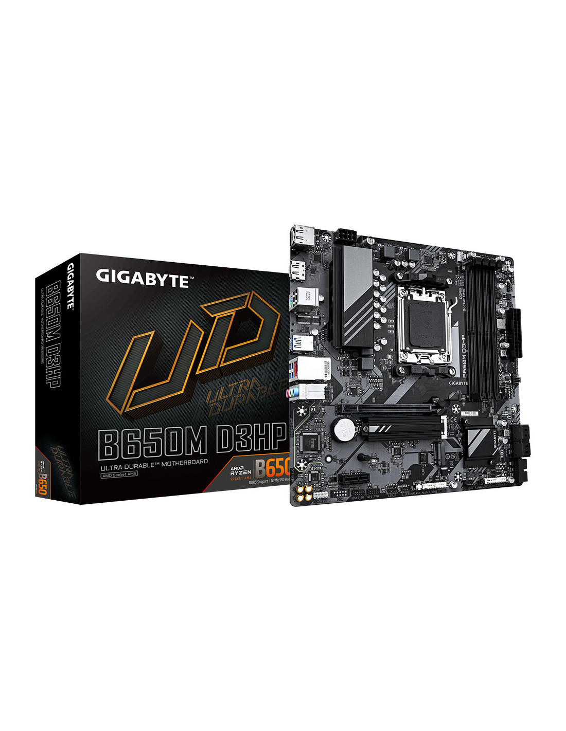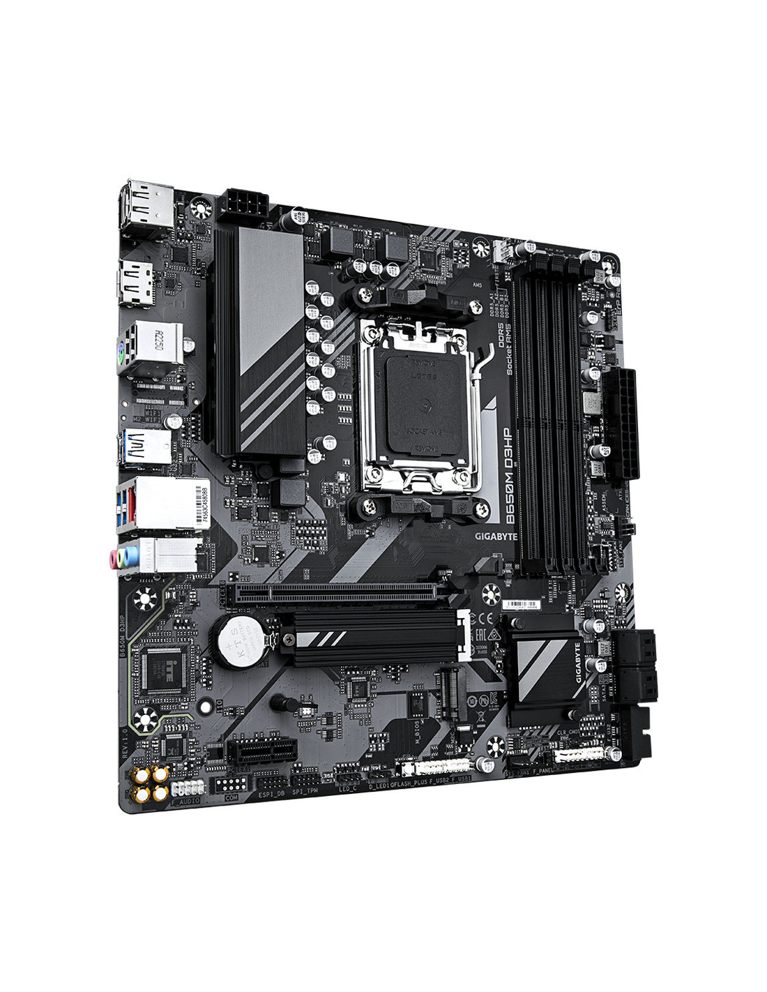 GIGABYTE B650M D3HP Placa base - AMD Ryzen serie 9000, VRM de 5+2+2 fases, hasta 7600 MHz DDR5 (OC), 2xPCIe 4.0 M.2, LAN 2,5 GbE, USB 3.2 Gen 1. Fabricante de procesador: AMD, Socket de procesador: Zócalo AM5, Procesador compatible: AMD Ryzen 7000 Series, AMD Ryzen 8000 Series, AMD Ryzen 9000 Series. tipos de memoria compatibles: DDR5-SDRAM, Memoria interna máxima: 256 GB, Tipo de ranuras de memoria: DIMM. Interfaces de disco de almacenamiento soportados: M.2, SATA III, Tipos de unidades de almacenamiento admitidas: HDD & SSD, Niveles RAID: 0, 1, 10. Máxima resolución: 4096 x 2160 Pixeles. Tipo de interfaz ethernet: 2.5 Gigabit Ethernet, Controlador LAN: Realtek RTL8125