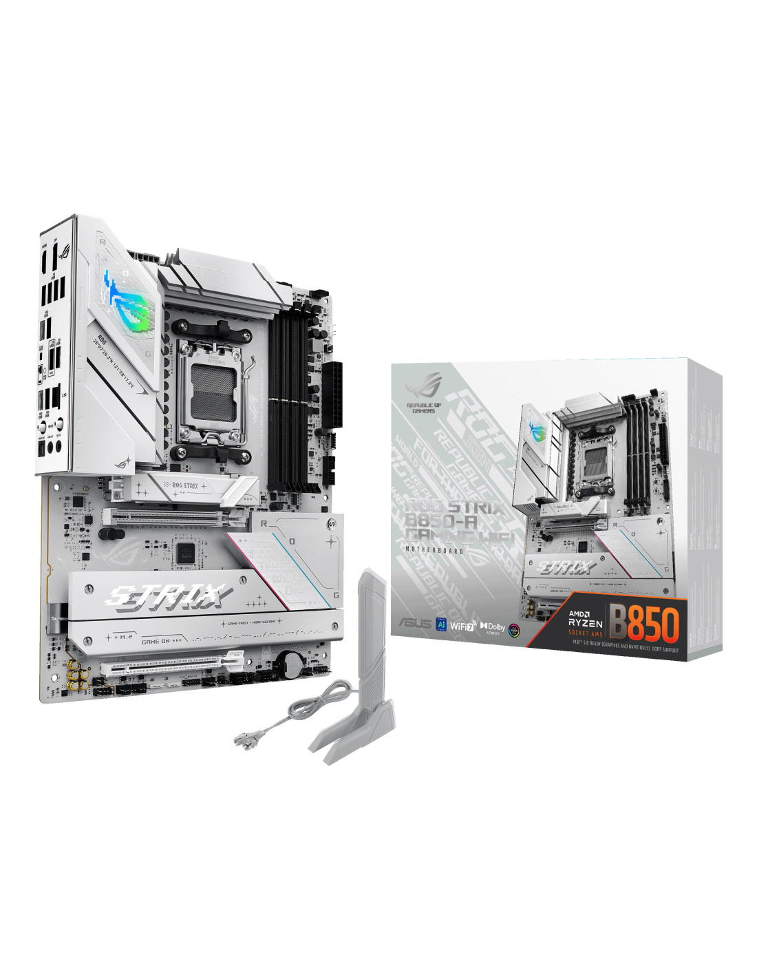 ASUS ROG STRIX B850-A GAMING WIFI. Fabricante de procesador: AMD, Socket de procesador: Zócalo AM5, Procesador compatible: AMD Ryzen 7000 Series, AMD Ryzen 8000 Series, AMD Ryzen 9000 Series. tipos de memoria compatibles: DDR5-SDRAM, Memoria interna máxima: 192 GB, Tipo de ranuras de memoria: DIMM. Interfaces de disco de almacenamiento soportados: M.2, SATA III, Tipos de unidades de almacenamiento admitidas: HDD & SSD, Niveles RAID: 0, 1, 5, 10. Máxima resolución: 7680 x 4320 Pixeles. Tipo de interfaz ethernet: 2.5 Gigabit Ethernet, Estándar Wi-Fi: Wi-Fi 7 (802.11be), Wi-Fi estándares: Wi-Fi 7 (802.11be)