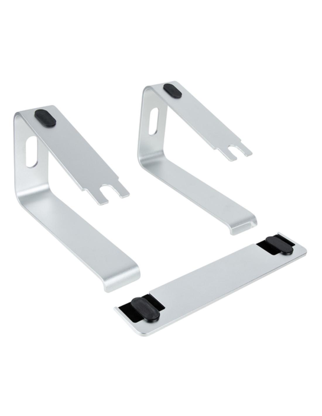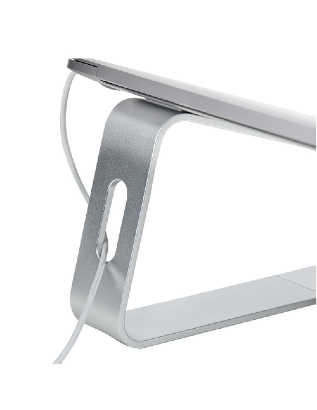 El elegante elevador de portátiles presenta un acabado anodizado en plata con piezas de aluminio de 5mm de grosor para garantizar su durabilidad. Los dos brazos de soporte crean una superficie efectiva de 210x260mm y proporcionan un generoso espacio debajo para la refrigeración pasiva y el flujo de aire, y pueden utilizarse para guardar un teclado, un ratón u otros accesorios y periféricos cuando no se utilizan.