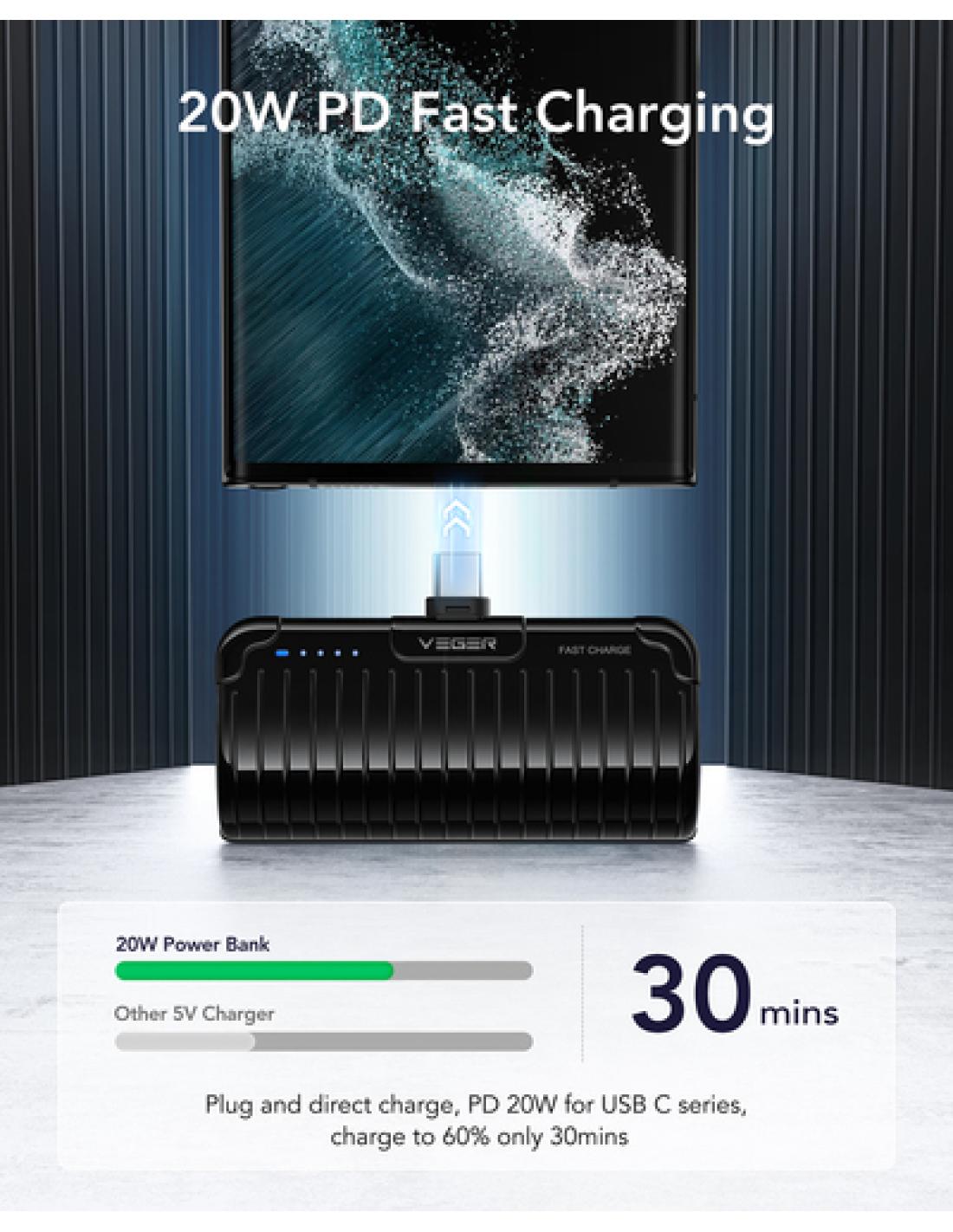 VEGER PLUGON-C VG-W0558 PRO 5000 Powerbank Type-C Bulit-in with KickStand. Capacidad de batería: 5000 mAh, Tecnología de batería: Ión de litio. Potencia total de salida: 20 W. Color del producto: Negro