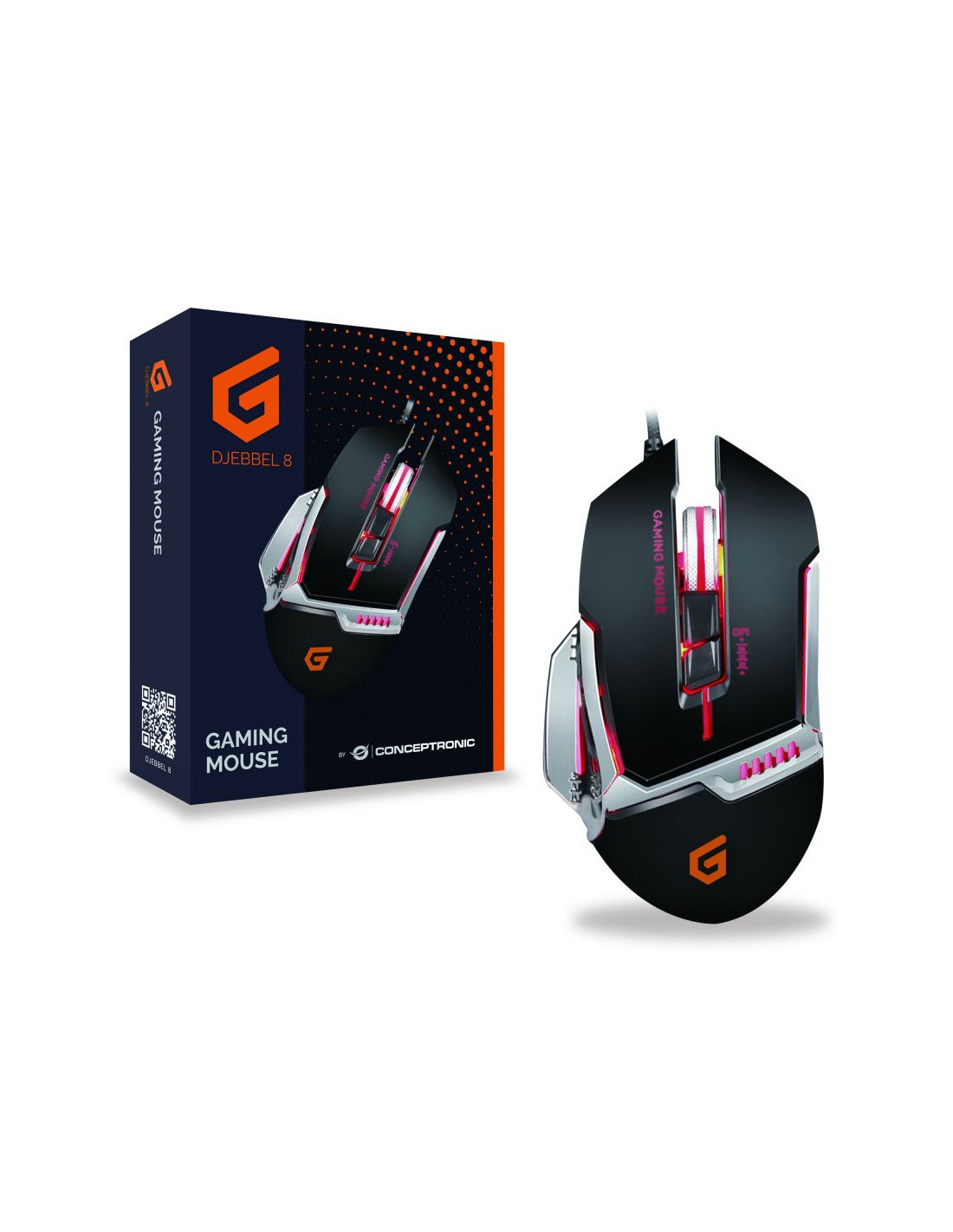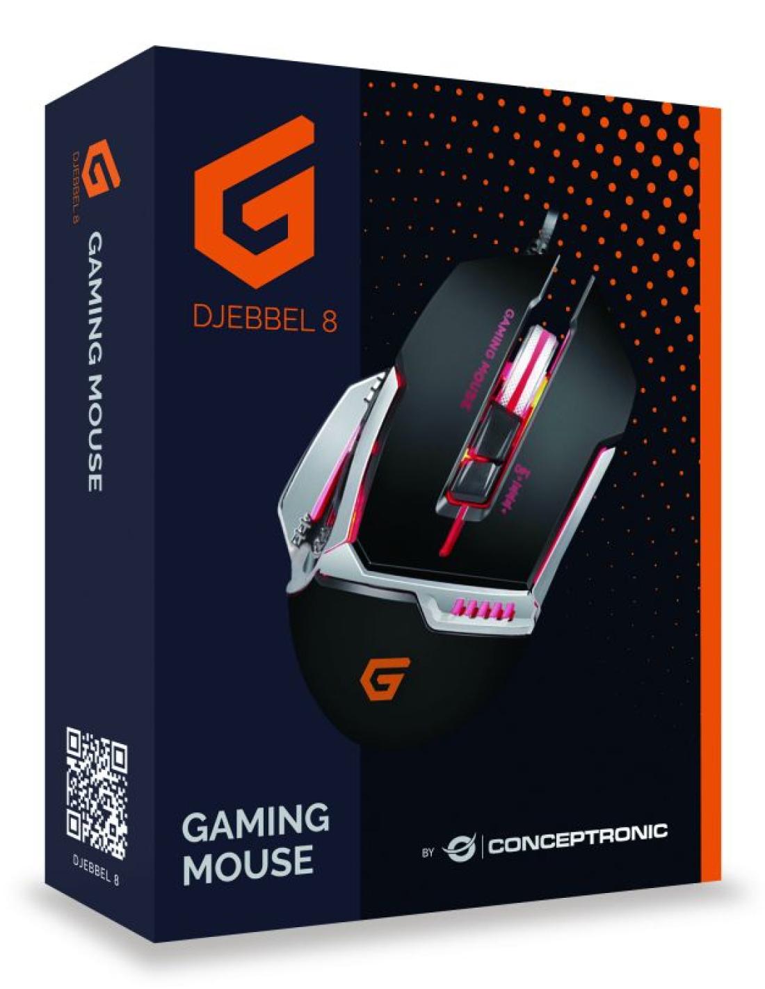 Conceptronic DJEBBEL 8. Tecnología de detección de movimientos: Óptico, Interfaz del dispositivo: USB tipo A, Resolución de movimiento: 4000 DPI, Tiempo de respuesta: 1 ms, Tipo de botones: Botones presionados, Cantidad de botones: 8, Tipo de desplazamiento: Rueda, Aceleración (máx.): 20 G. Fuente de energía: Cable. Color del producto: Negro, Plata