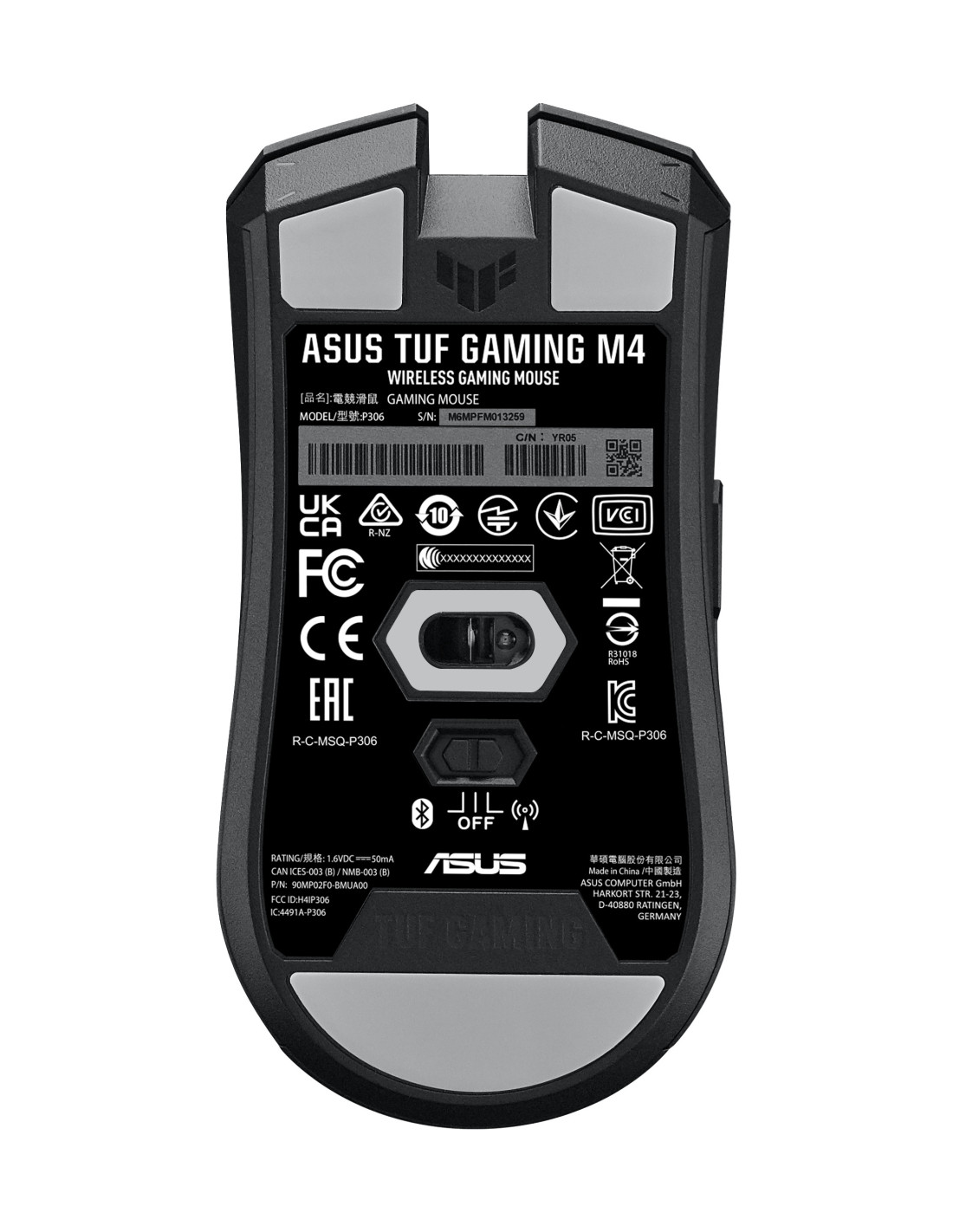 ASUS TUF Gaming M4 Wireless. Factor de forma: mano derecha. Tecnología de detección de movimientos: Óptico, Interfaz del dispositivo: RF Wireless + Bluetooth, Resolución de movimiento: 12000 DPI, Tipo de botones: Botones presionados, Cantidad de botones: 6, Tipo de desplazamiento: Rueda. Fuente de energía: Baterías. Color del producto: Negro