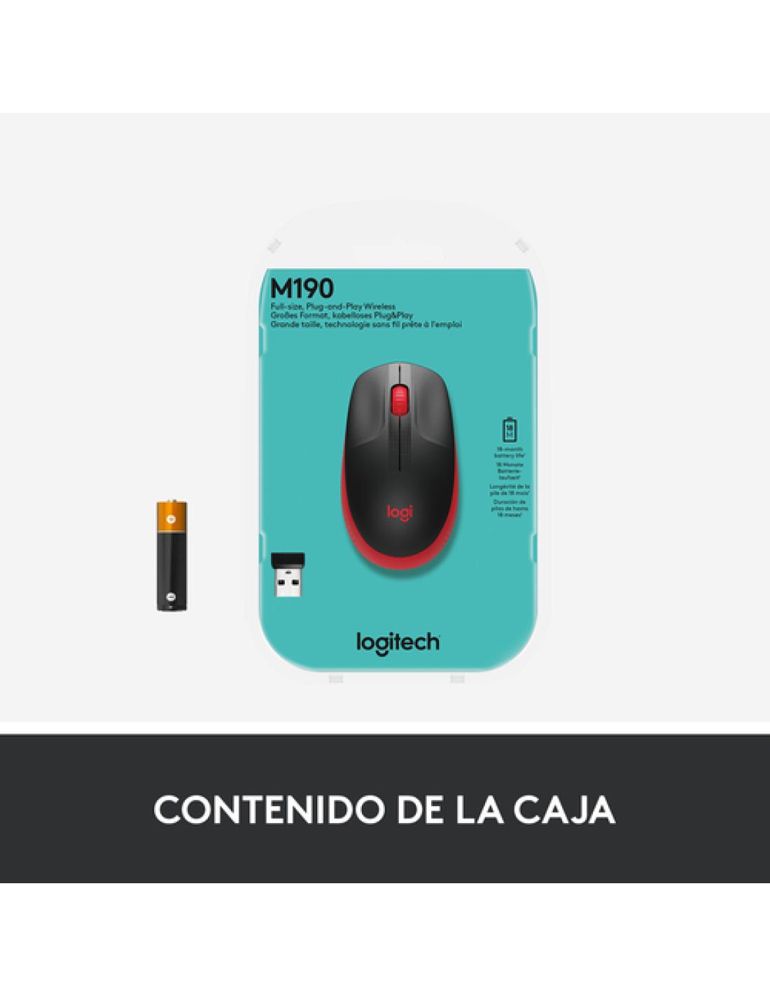 Logitech M190. Factor de forma: Ambidextro. Tecnología de detección de movimientos: Óptico, Interfaz del dispositivo: RF inalámbrico, Resolución de movimiento: 1000 DPI, Tipo de botones: Botones presionados, Cantidad de botones: 3, Tipo de desplazamiento: Rueda. Fuente de energía: Baterías. Color del producto: Rojo