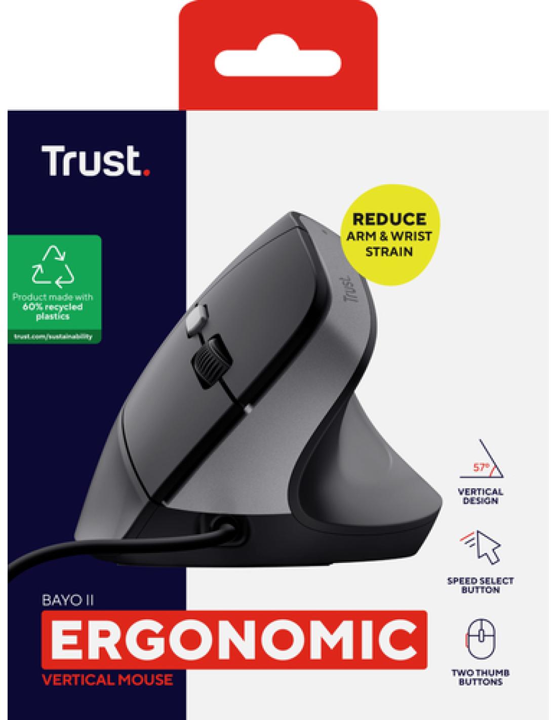 El ratón Bayo II hace que el día de trabajo sea más agradable. Con un ángulo óptimo de 57°, este ratón se ha diseñado con una forma ergonómica que facilita la posición más cómoda y natural del brazo y la muñeca, para trabajar de forma más relajada.