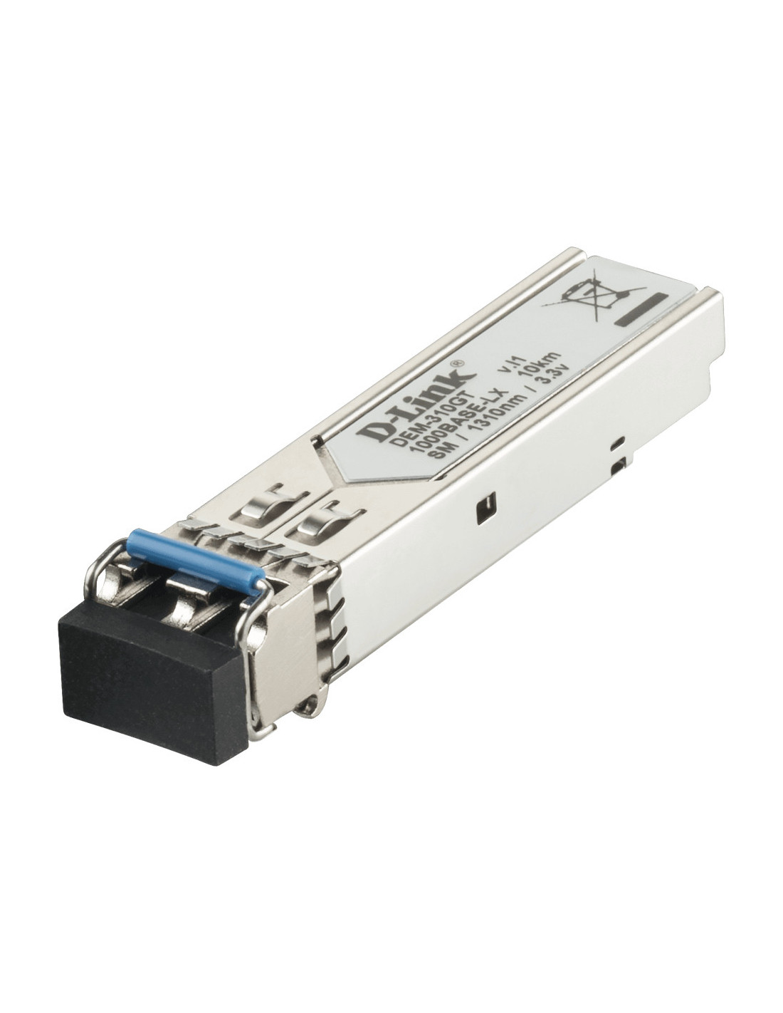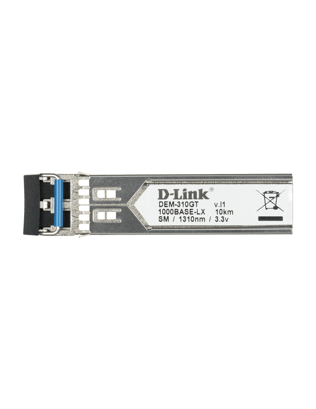 D-Link DEM-310GT. Tipo de transceptor SFP: Cobre, Rango máximo de transferencia de datos: 1000 Mbit/s, Tipo de interfaz: SFP. Color del producto: Negro, Acero inoxidable, Factor de forma: SFP. Voltaje de entrada: 3.3 V, Máxima corriente: 0,3 A. Certificados de conformidad: RoHS, Certificación: FCC Class B, ICES-003 Class B, CE Class B, VCCI Class B, FDA/CDRH, TUV, cUL. Ancho: 13,4 mm, Profundidad: 56,4 mm, Altura: 10,3 mm