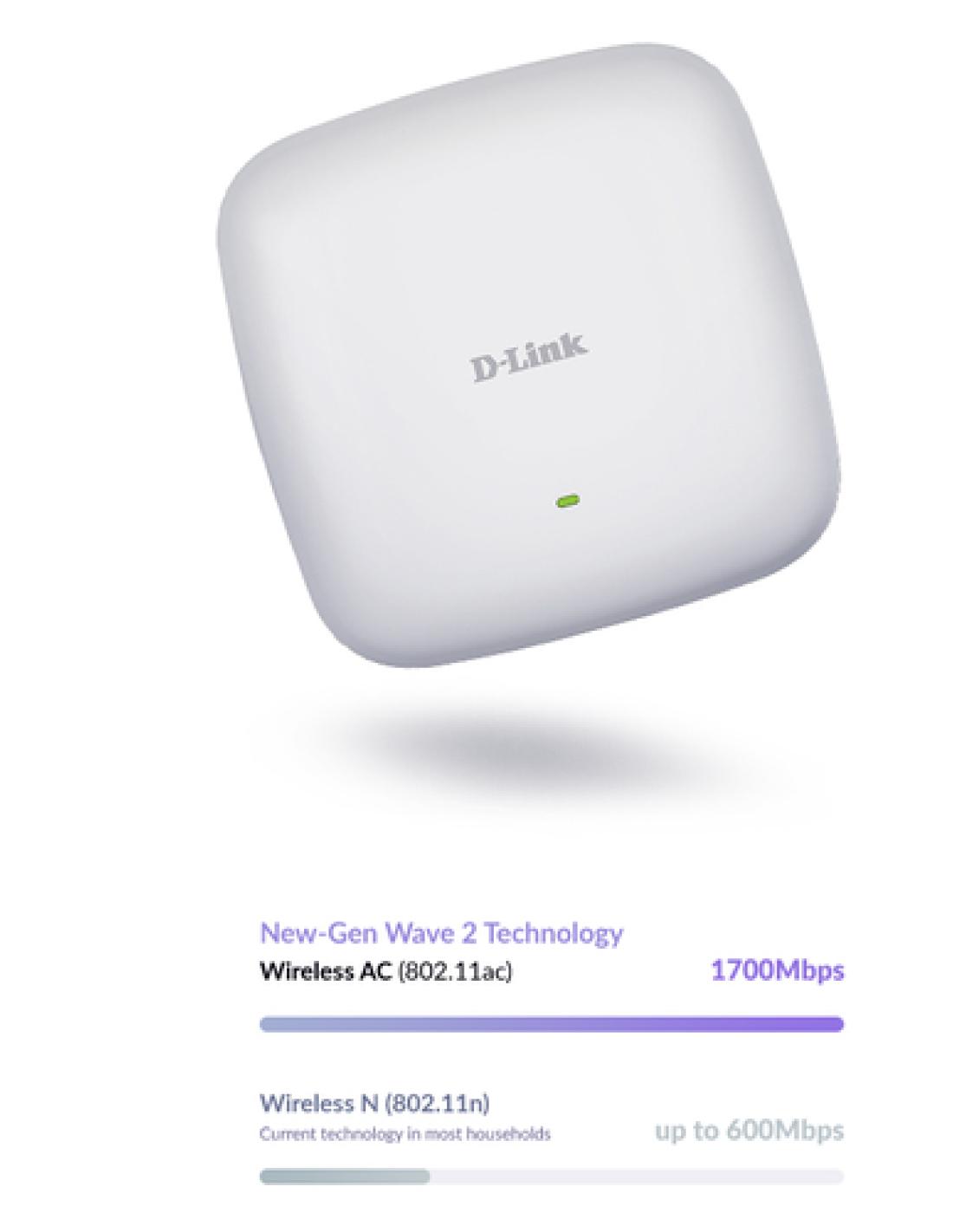 D-Link AC2300. 2,4 GHz, 5 GHz, Rango máximo de transferencia de datos: 1700 Mbit/s. Algoritmos de seguridad soportados: 64-bit WEP, 128-bit WEP, WPA2. Ethernet LAN, velocidad de transferencia de datos: 10,100,1000 Mbit/s. Energía sobre Ethernet (PoE). Color del producto: Blanco. Consumo de energía (max): 15,5 W