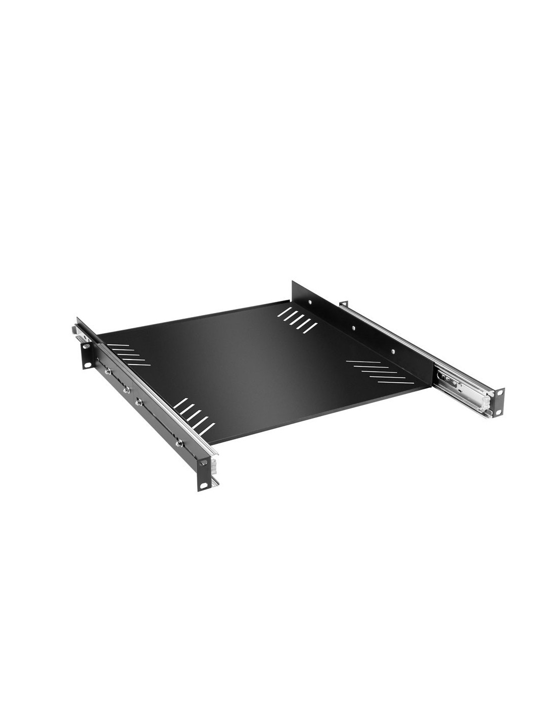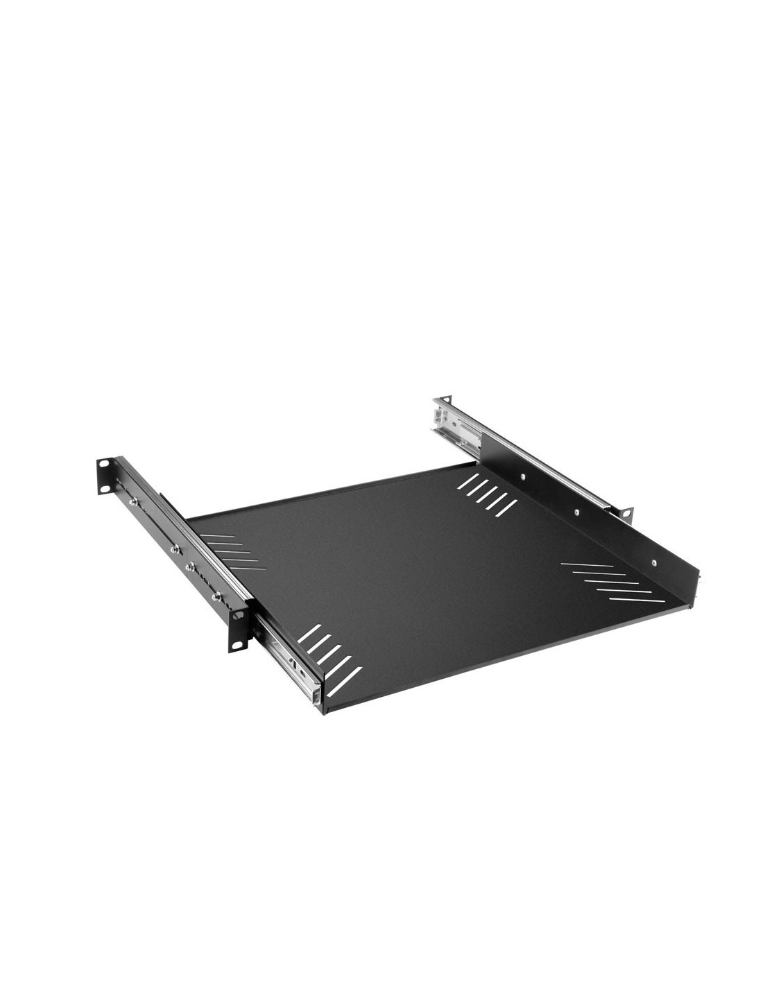 Bandeja para rack 19" 1 U extensible. Las guías correderas de los laterales se pueden ajustar en varias posiciones en la parte anterior y posterior. Estos anclajes permiten instalar la bandeja en racks de distintos tamaños de profundidad.