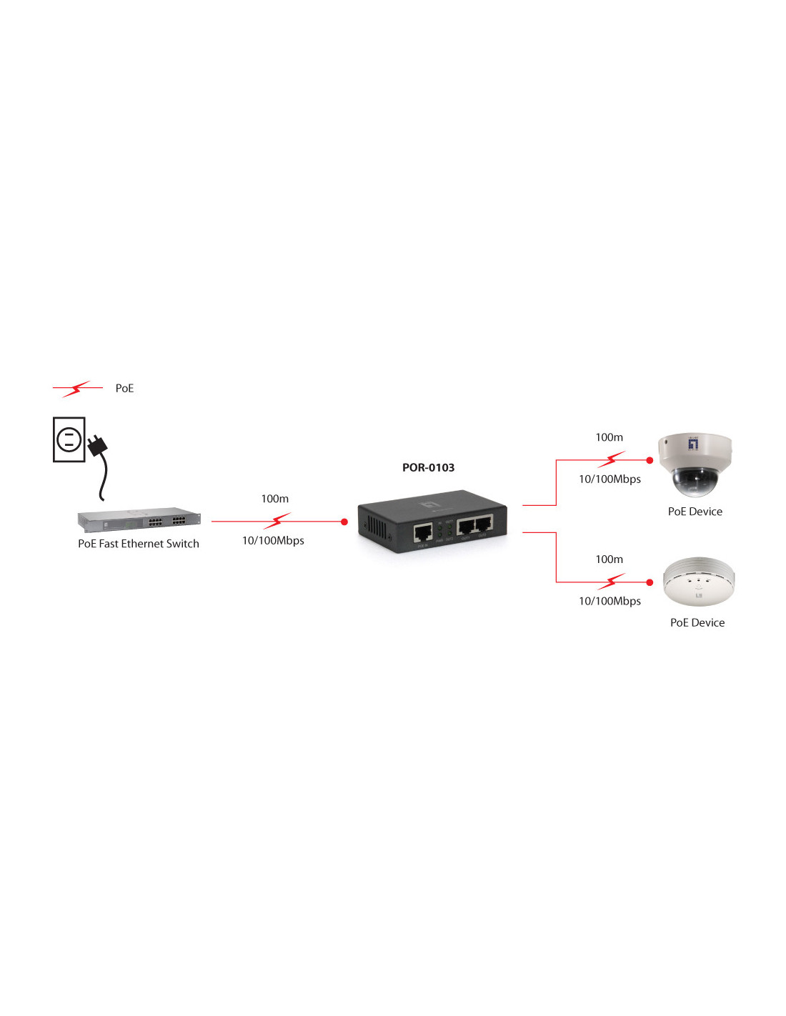 LevelOne Repetidor PoE, 2 PoE Outputs. Tipo: Repetidor de red, Distancia de transferencia máxima: 100 m. Tecnología de cableado: 10/100Base-T(X), Estándares de red: IEEE 802.3, IEEE 802.3af, IEEE 802.3at, IEEE 802.3u, IEEE 802.3x. Color del producto: Negro, Tipo de montaje: Pared, Indicadores LED: PoE, Poder. Consumo de energía (max): 2,5 W, Rango de tensión de alimentación a través de Ethernet (PoE): 46 - 57 V. Ancho: 57 mm, Profundidad: 21 mm, Altura: 91 mm