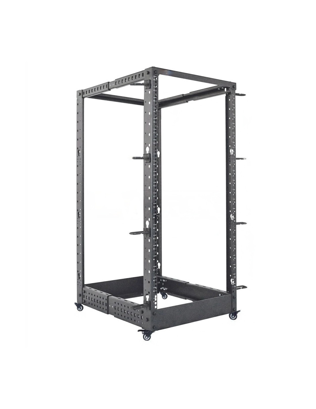Fabricado en resistente acero laminado con recubrimiento en polvo, ofrece excelente calidad y durabilidad para su instalación. Se suministra desmontado en una única caja completa con ruedas, pies y anillos laterales para la gestión de cables. El montaje es muy sencillo y rápido y esta solución permite ahorrar en costes de transporte y evitar daños.
