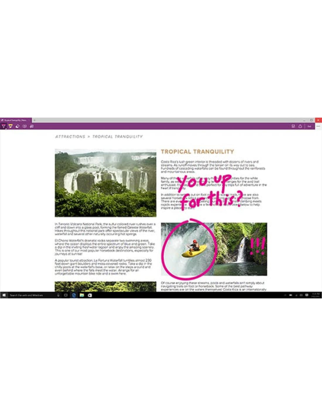 Usa la red del modo que quieras.Microsoft Edge te permite pasar rápidamente de la navegación al trabajo. Escribe1 o haz anotaciones directamente en páginas web y compártelas con otras personas. Lee artículos online sin distracciones y guarda tus lecturas favoritas para más tarde. Con Cortana activado, puedes resaltar un término que desconozcas para obtener una explicación contextual sin salir de donde estás.